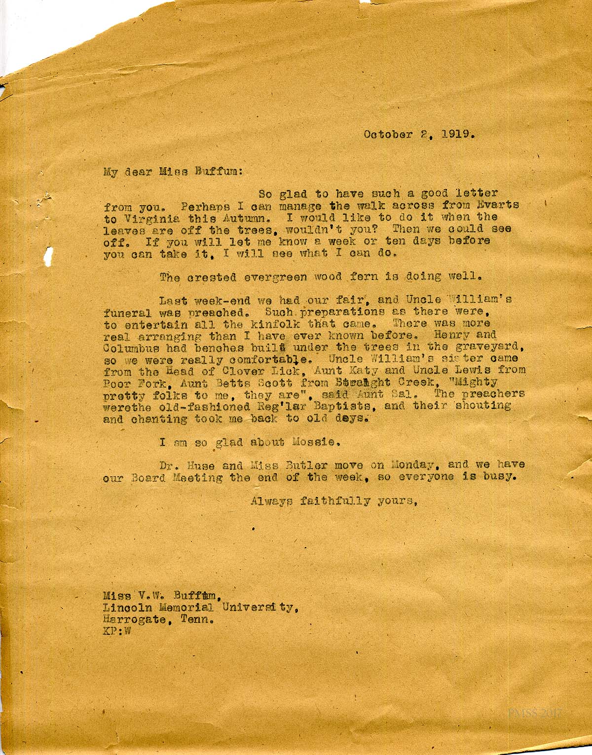1919 March 4 To Miss V.W. Buffum, Lincoln Memorial University, Harrogate, Tenn. from Katherine Pettit inviting her to come to PMSS to tutor and for a Black Mountain Wildflower Weekend [First mention of the annual event ?]. She notes that she hopes that Miss Buffum “…will be here to control Mr. [Leon] Deschamps‘ perfect acre work!”