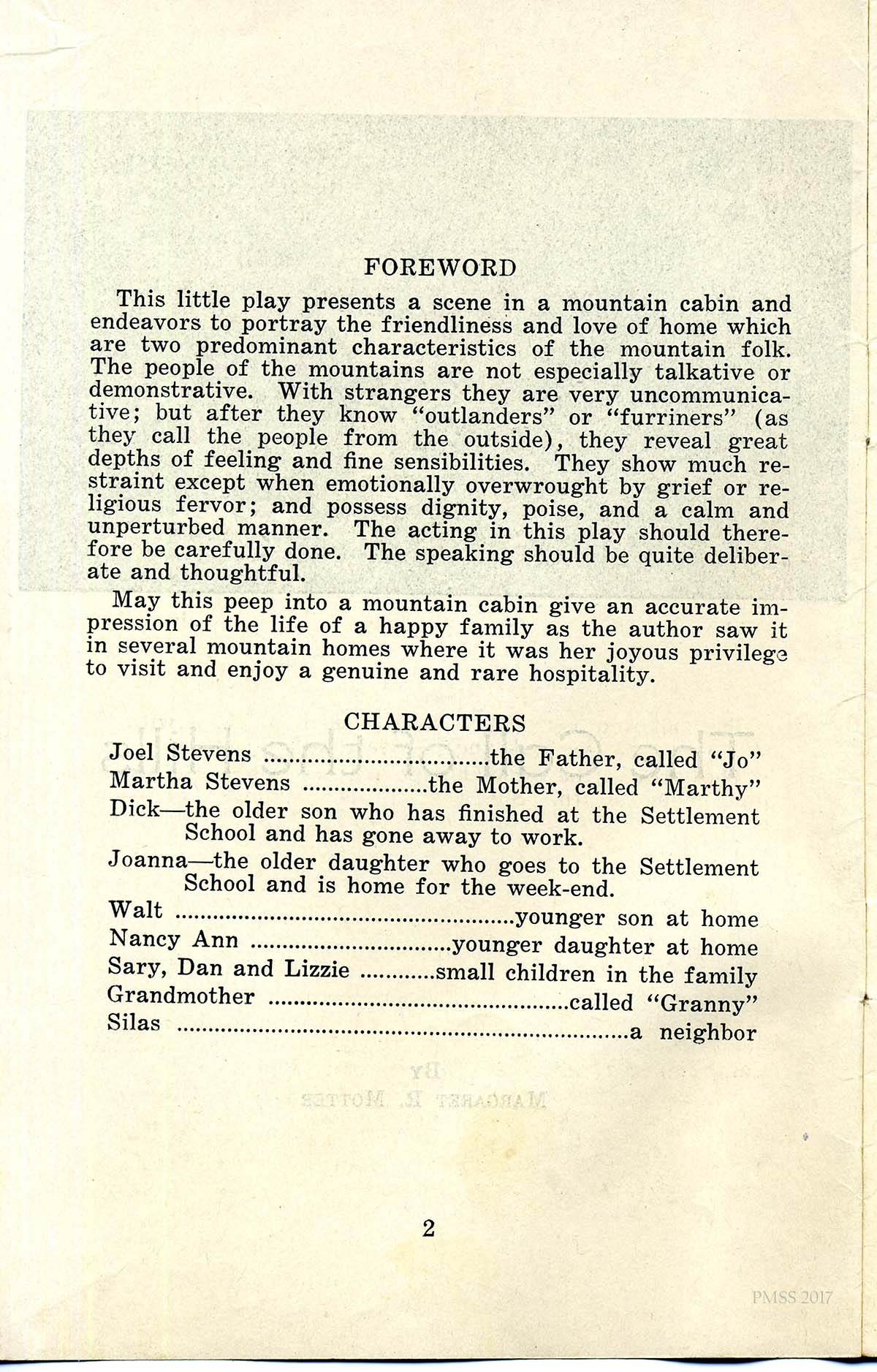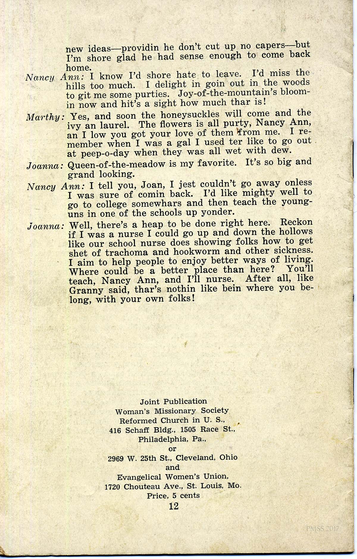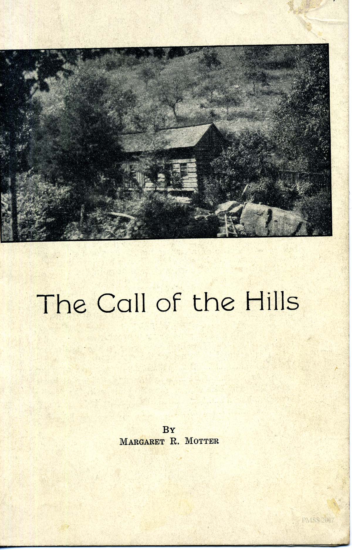 Margaret Motter‘s play, The Call of the Hills, was written from her experiences at Pine Mountain Settlement School (PMSS) in Harlan County, Kentucky. The play, written in local dialect, is brief but provides a window into the lives of the community as seen through the eyes of Motter. It was published jointly by the Women’s Missionary Society of Philadelphia and the Evangelical Women’s Union in St. Louis, Missouri. The publication date is unknown but probably followed Motter’s departure from Pine Mountain in 1938. She returned to PMSS in 1946 and taught until the Boarding School closed in 1949. The names of the characters in the play are reminiscent of an amalgam of students enrolled in the late 1930s and the early 1940s.