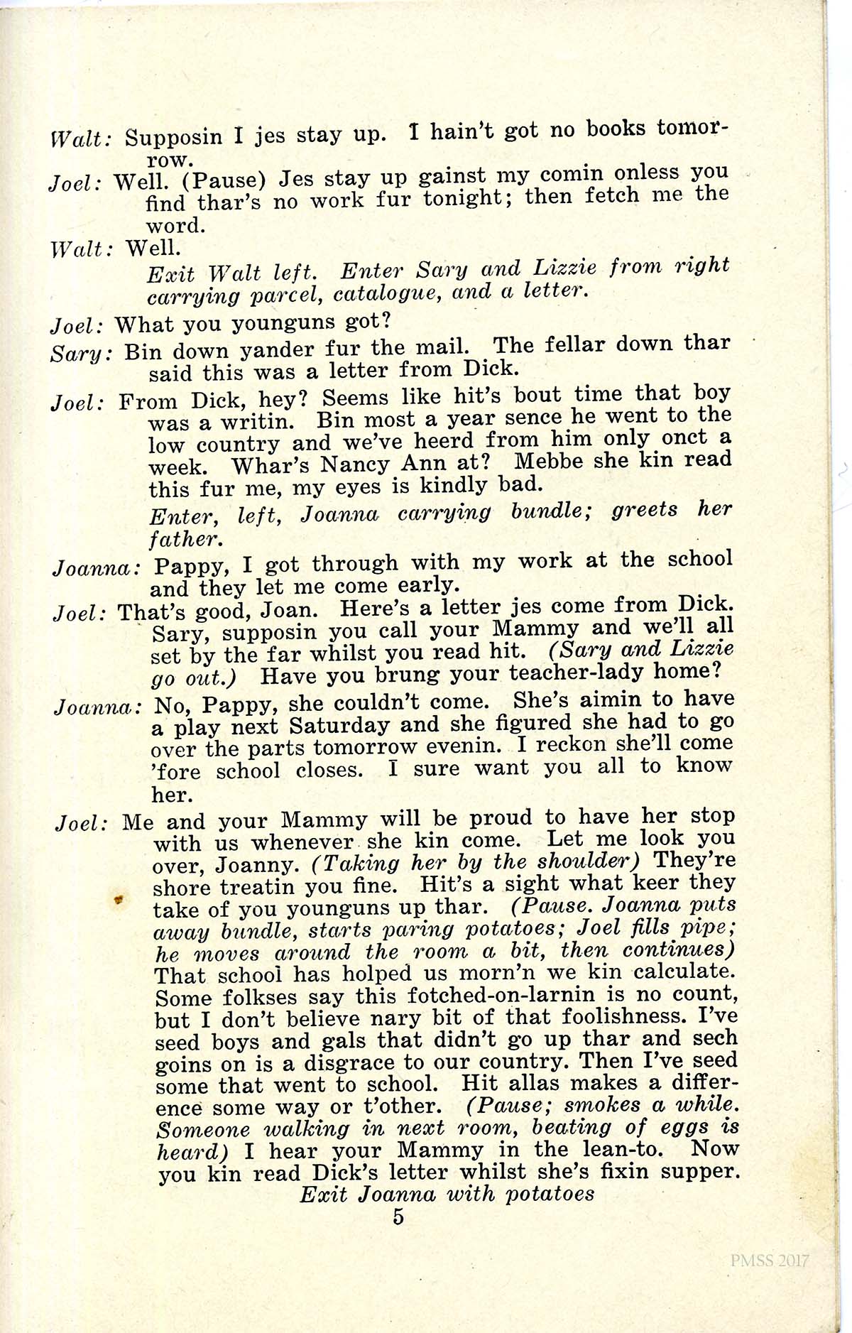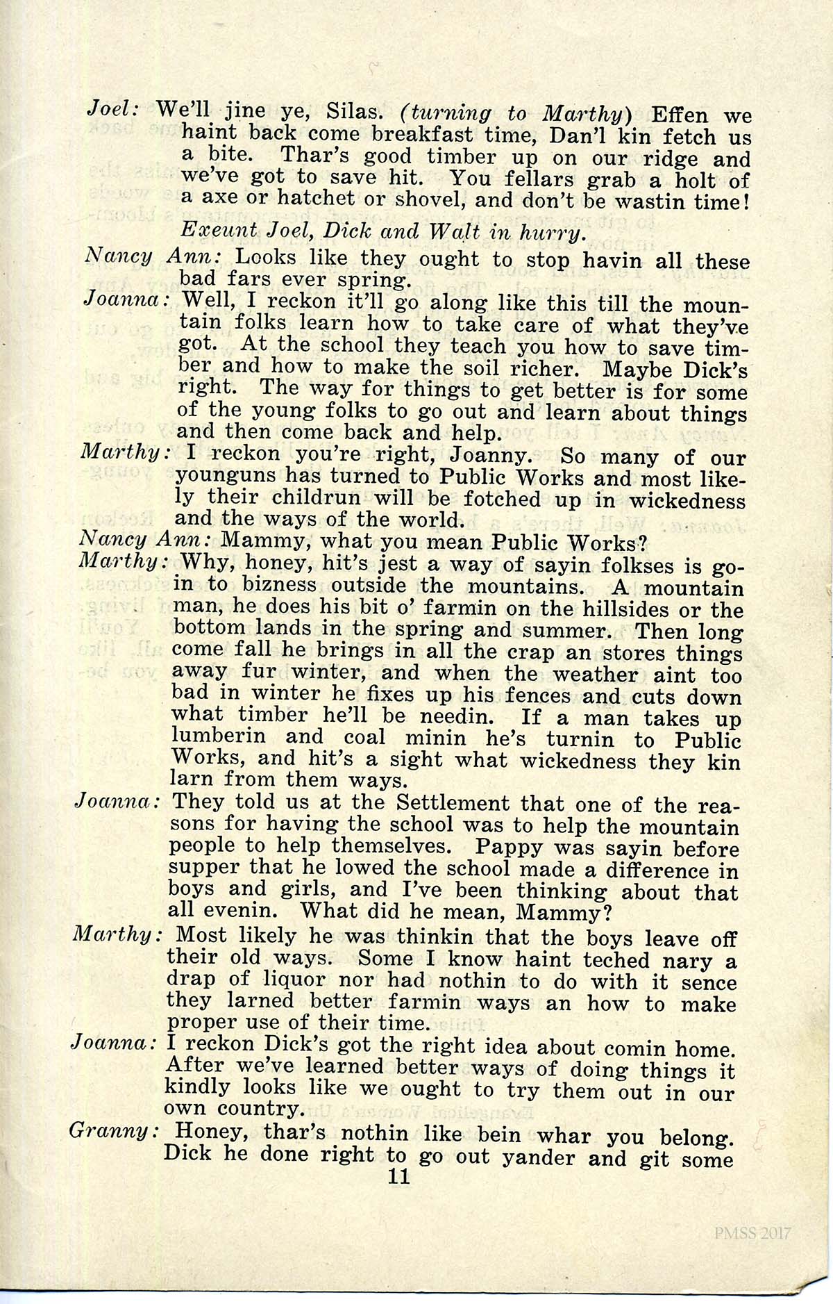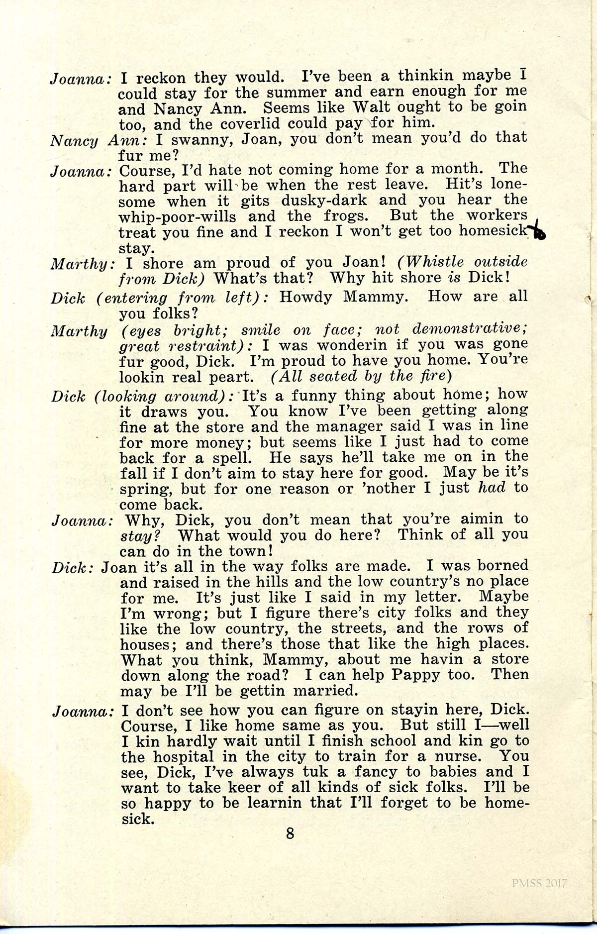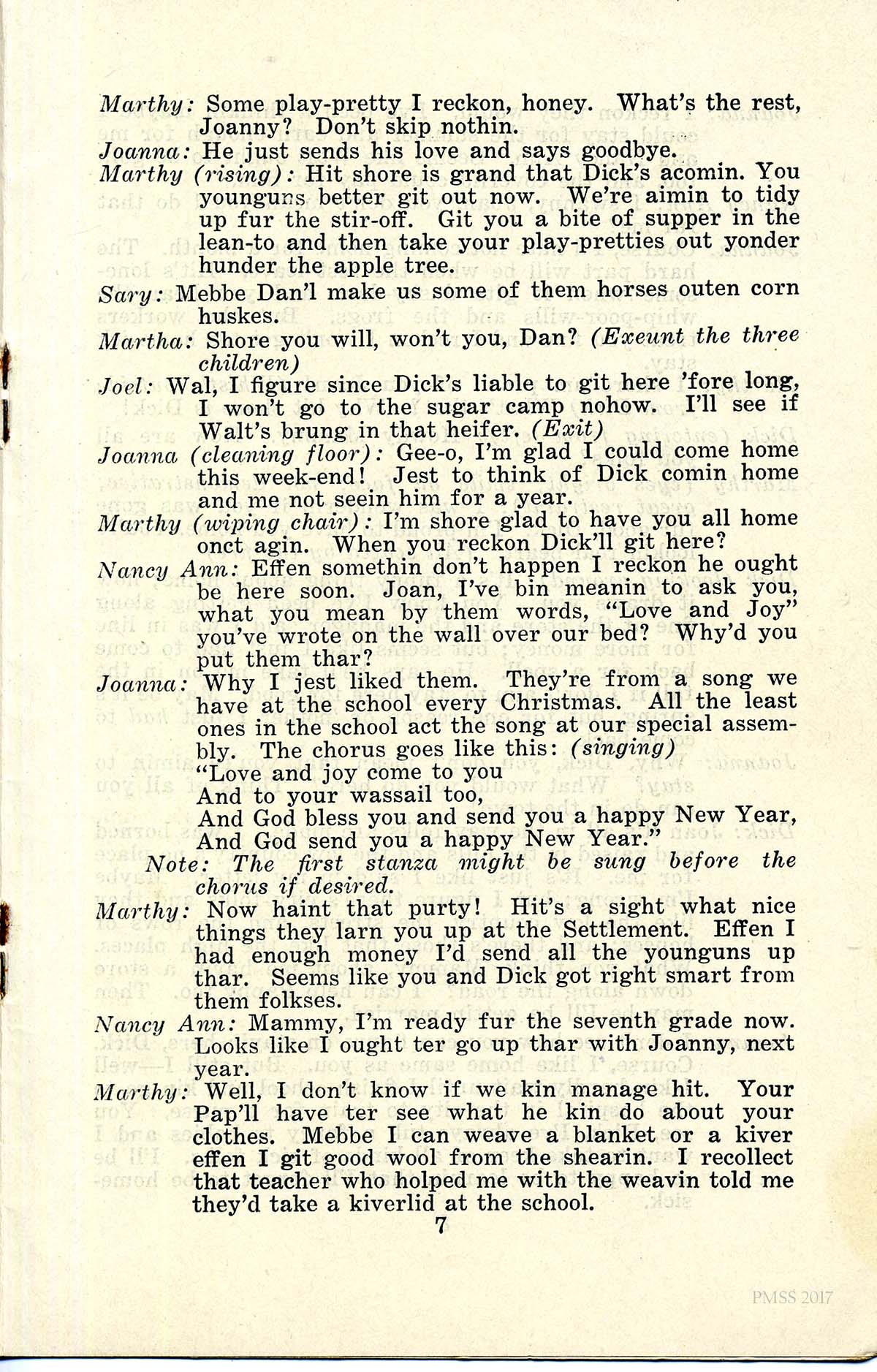 Margaret Motter‘s play, The Call of the Hills, was written from her experiences at Pine Mountain Settlement School (PMSS) in Harlan County, Kentucky. The play, written in local dialect, is brief but provides a window into the lives of the community as seen through the eyes of Motter. It was published jointly by the Women’s Missionary Society of Philadelphia and the Evangelical Women’s Union in St. Louis, Missouri. The publication date is unknown but probably followed Motter’s departure from Pine Mountain in 1938. She returned to PMSS in 1946 and taught until the Boarding School closed in 1949. The names of the characters in the play are reminiscent of an amalgam of students enrolled in the late 1930s and the early 1940s.