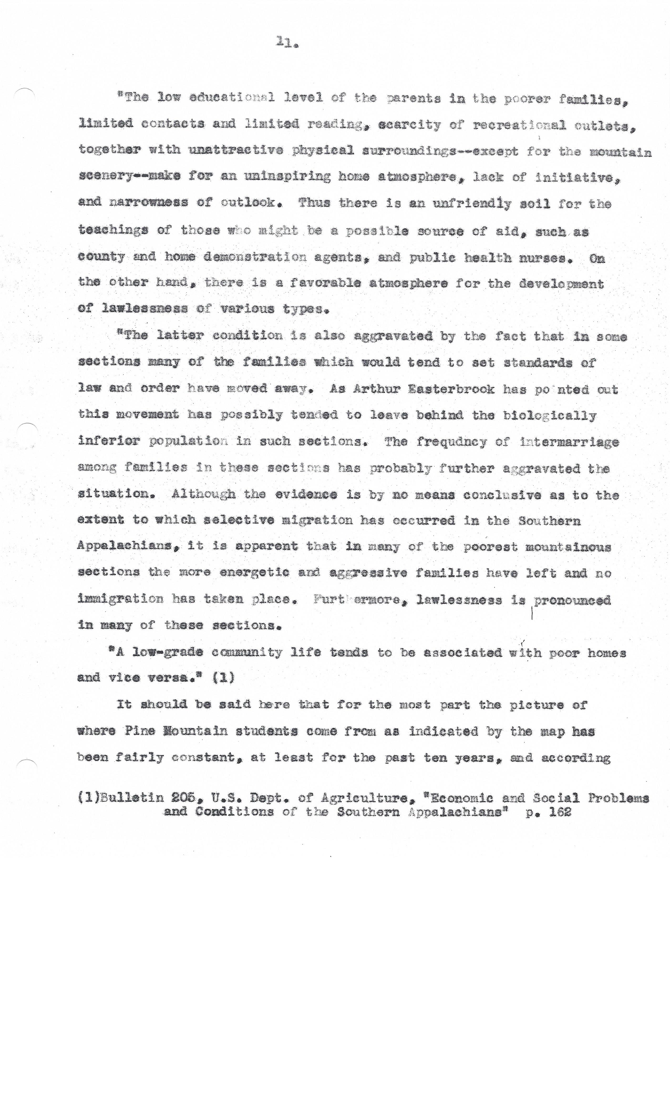 “The low educational level of the parents in the poorer families, limited contacts and limited reading, scarcity of recreational outlets, together with unattractive physical surroundings — except for the mountain scenery — make for an uninspiring home atmosphere, lack of initiative, and narrowness of outlook. Thus there is an unfriendly soil for the teachings of those who might be a possible source of aid, such as county and home demonstration agents, and public health nurses. On the other hand, there is a favorable atmosphere for the development of lawlessness of various types.