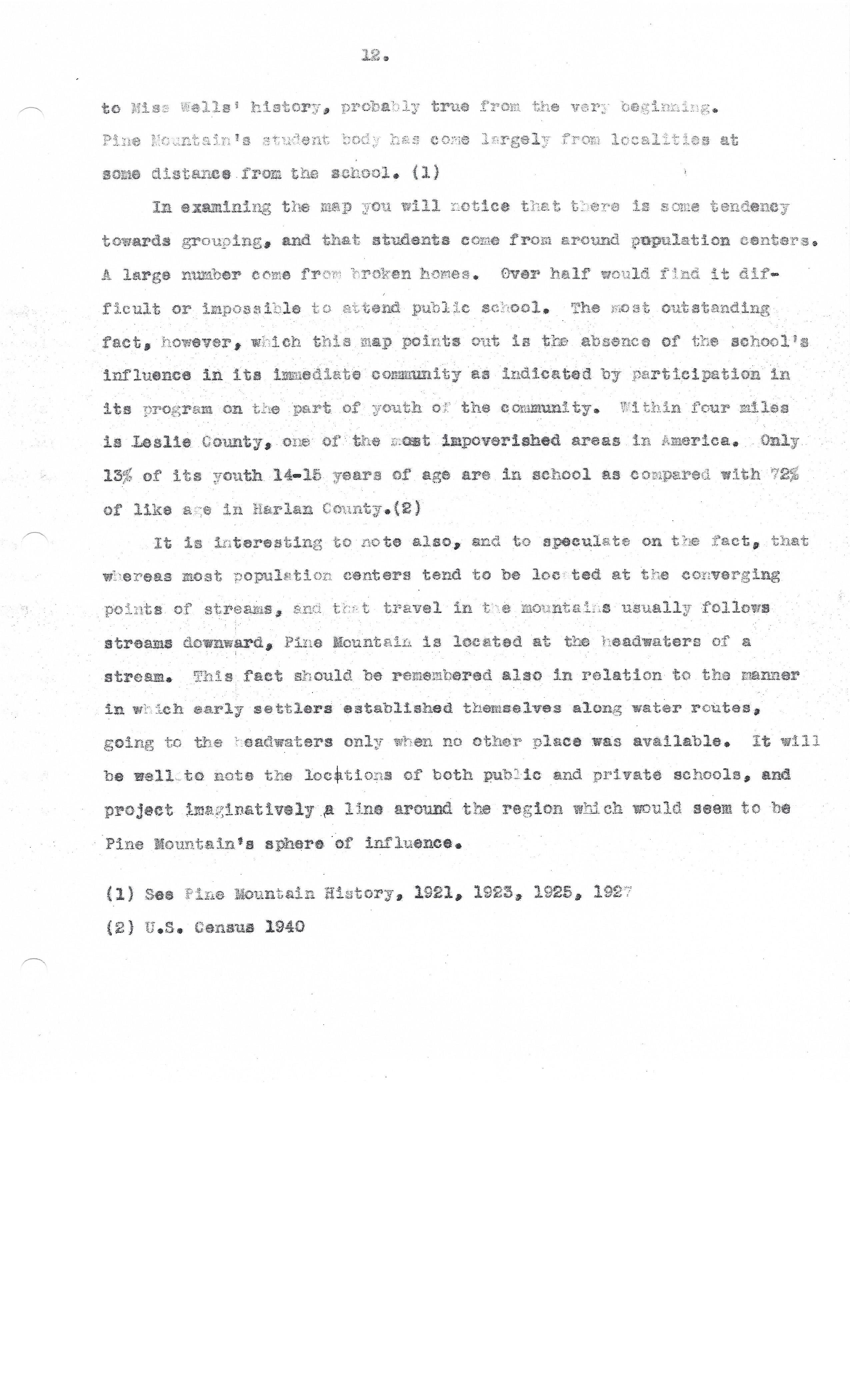 No figures are available to us on income, but in normal times, if we accept studies made in similar regions in adjacent counties(1) it can be anywhere from $50.00 annually in cash, up, but hardly ever over a few hundred dollars. A genealogical chart compiled 1937[?] by Miss Grace Rood shows much intermarriage between a few families. A former Pine Mountain worker, a student of mountain problems, familiar with other areas within the mountains, characterizes the neighborhood as being the most retarded [backward-looking] and the least promising she has ever seen.