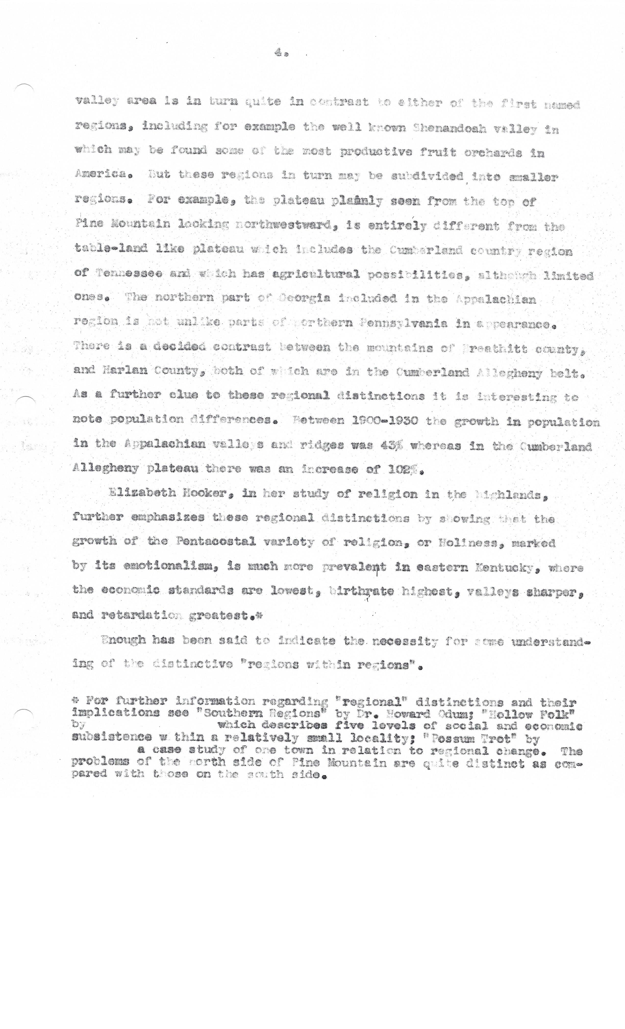 * For further information regarding “regional” distinctions and their implications see “Southern Regions” by Dr. Howard Odum; “Hollow Folk” by [missing text: Probably refers to Mandel Sherman & Thomas R. Henry’s book Hollow Folk, published in 1933 and in reprint Berryville, VA: Virginia Book Company, 1973] which describes five levels of social and economic subsistence within a relatively small locality; “Possum Trot” by [missing text: This possibly refers to Herman Clarence Nixon’s Possum Trot Rural Community, South, published by Norman, OK: University of Oklahoma Press, 1941], a case study of one town in relation to regional change. The problems of the north side of Pine Mountain are quite distinct as compared with those on the south side.