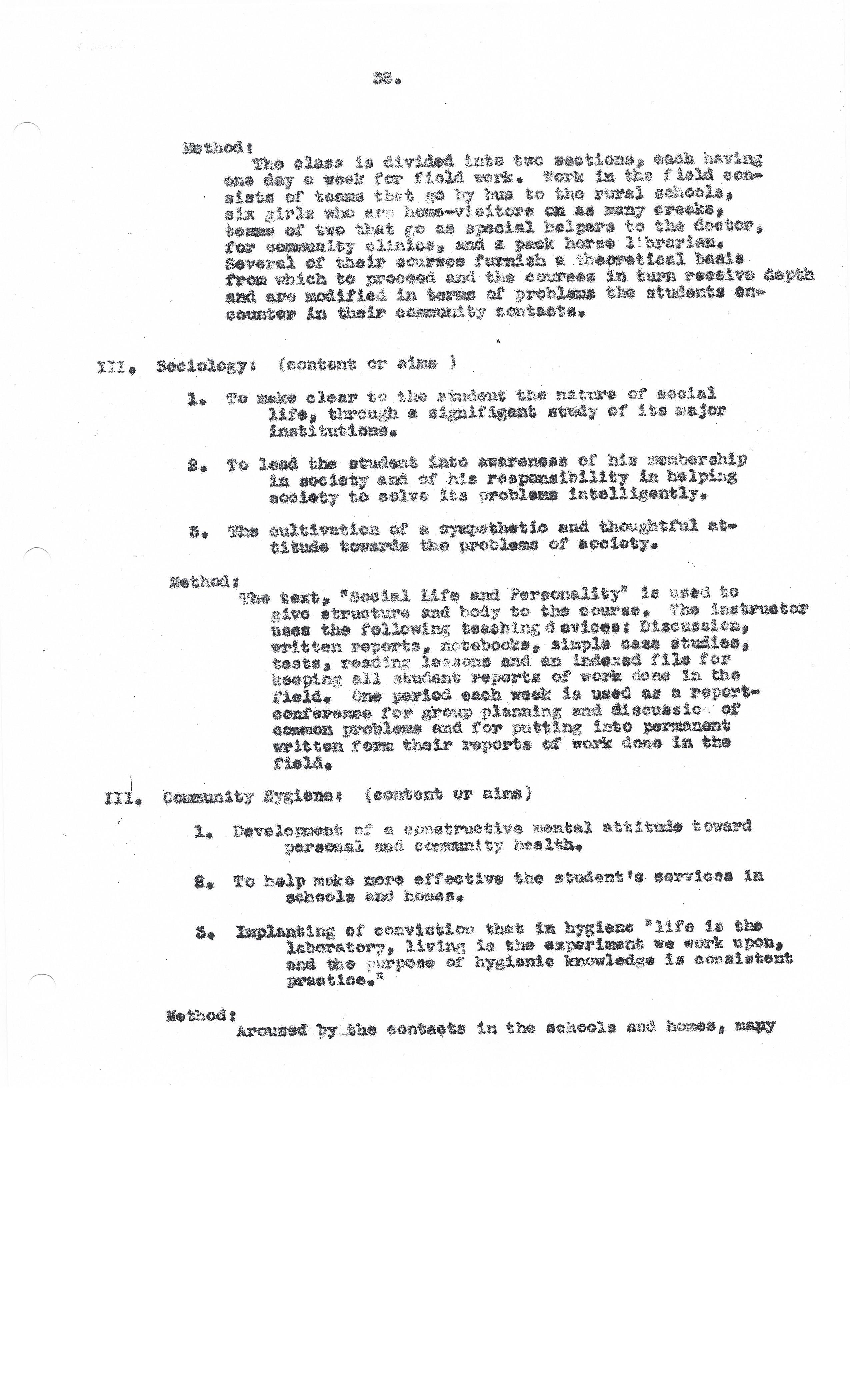 The class is divided into two sections, each having one day a week for field work. Work in the field consists of teams that go by bus to the rural schools, six girls who are home-visitors on as many creeks, teams of two that go as special helpers to the doctor, for community clinics, and a pack horse librarian. Several of their courses furnish a theoretical basis from which to proceed and the courses in turn receive depth and are modified in terms of problems the students encounter in their community contacts.