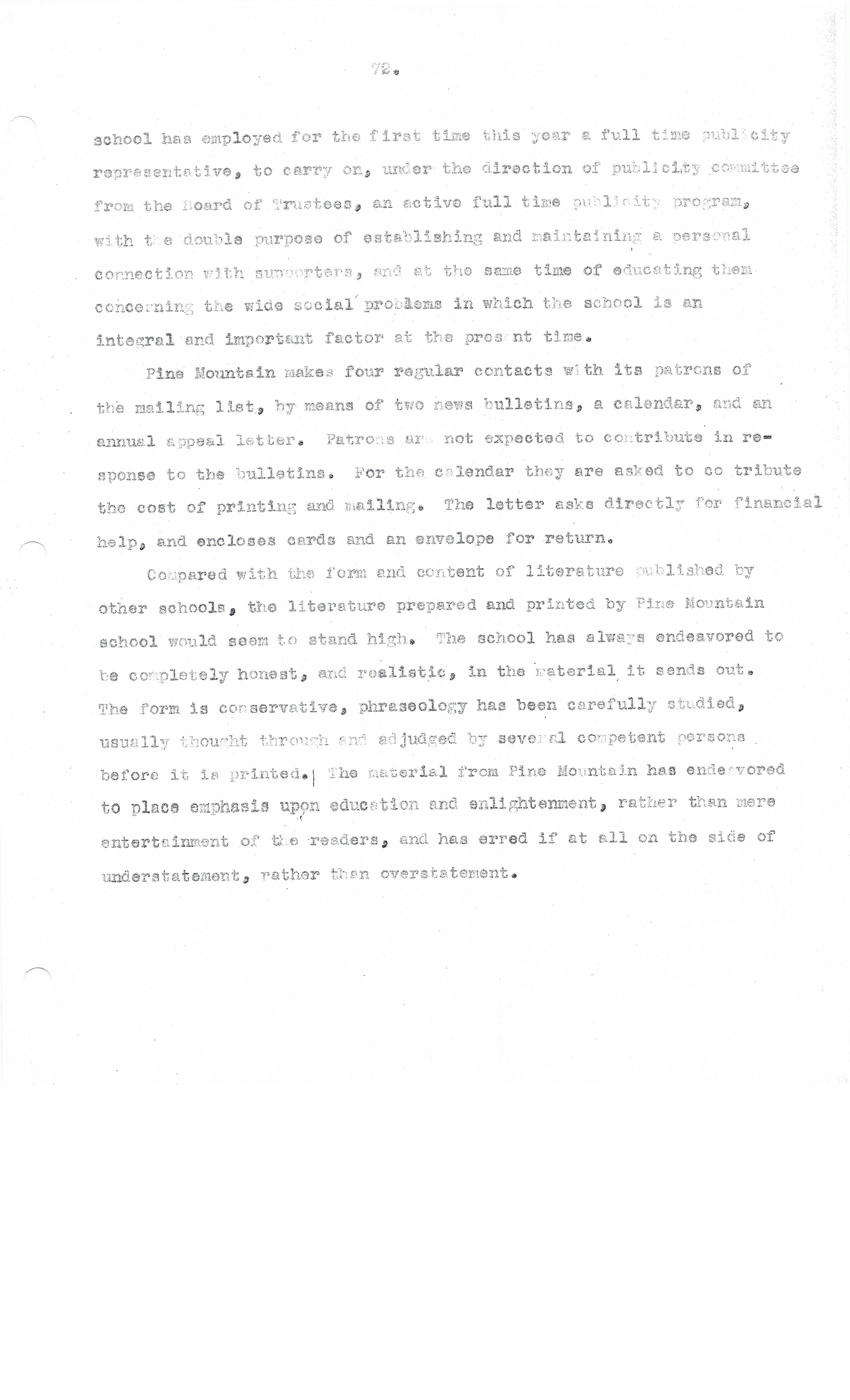 Compared with the form and content of literature published by other schools, the literature prepared and printed by Pine Mountain School would seem to stand high. The School has always endeavored to be completely honest and realistic in the material it sends out. The form is conservative [and the] phraseology has been carefully studied, usually thought through and adjudged by several competent persons before it is printed. The material from Pine Mountain has endeavored to place emphasis upon education and enlightenment rather than mere entertainment of the readers and has erred if at all on the side of understatement rather than overstatement.
