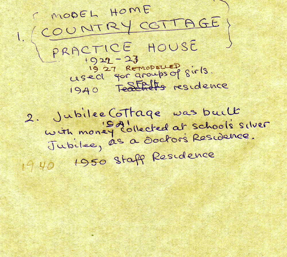 A handwritten note from 1940 indicates that the cottage was built with money collected at the School’s Silver Jubilee and was built first as a doctor’s residence and later (1950) as a residence for staff members.A progress report of the cottage’s construction was present to the Board of Trustees, c. 1940, by Director Glyn Morris: