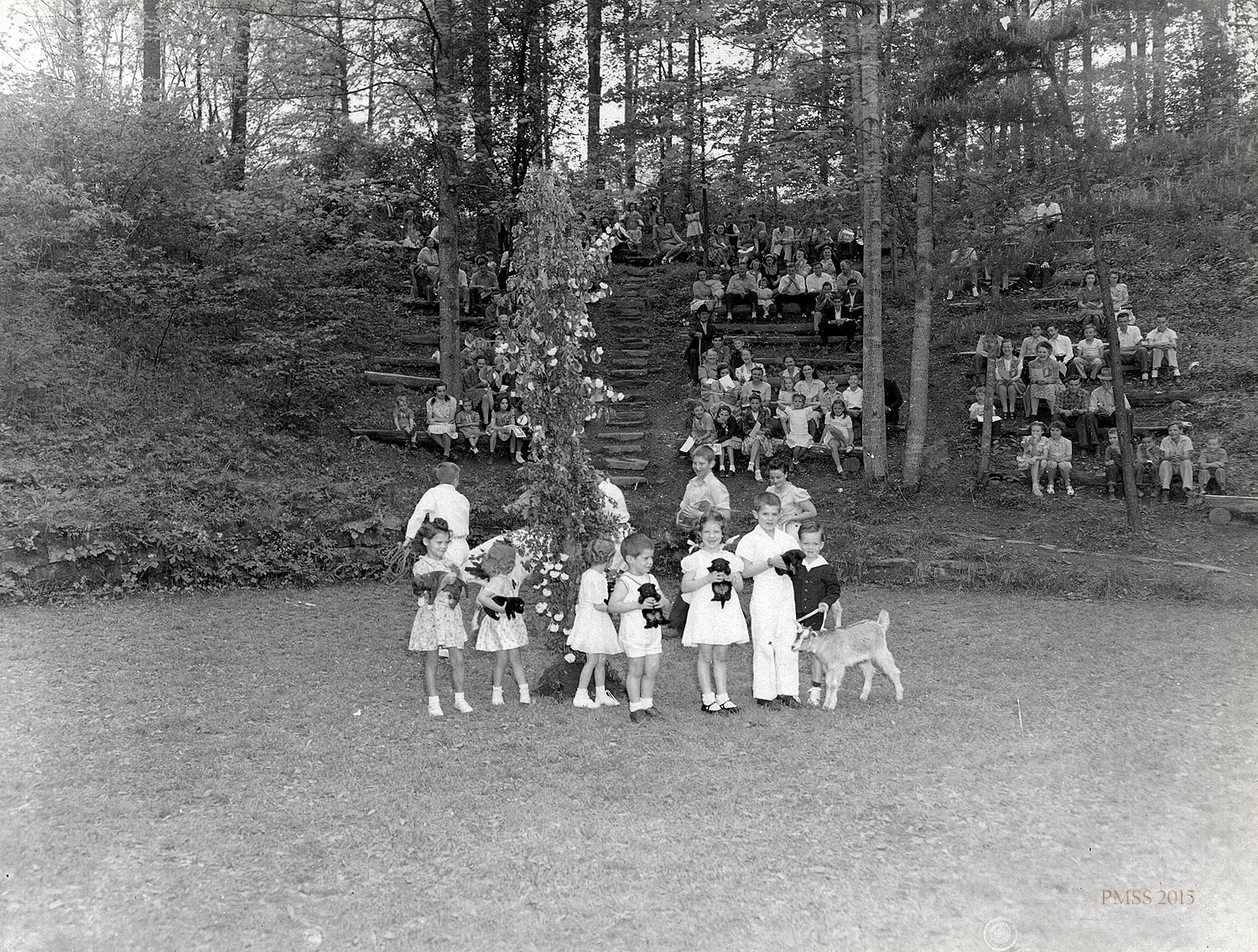 May Day on the Dancing Green (lft-rt) , Patsy O’Hern, Helen Hayes, David Barry, Frank Barry, Kathy Barry, Libby Dodd, Steven Hayes with goat. Arthur W. Dodd Album. [dodd_A_048_mod.jpg]