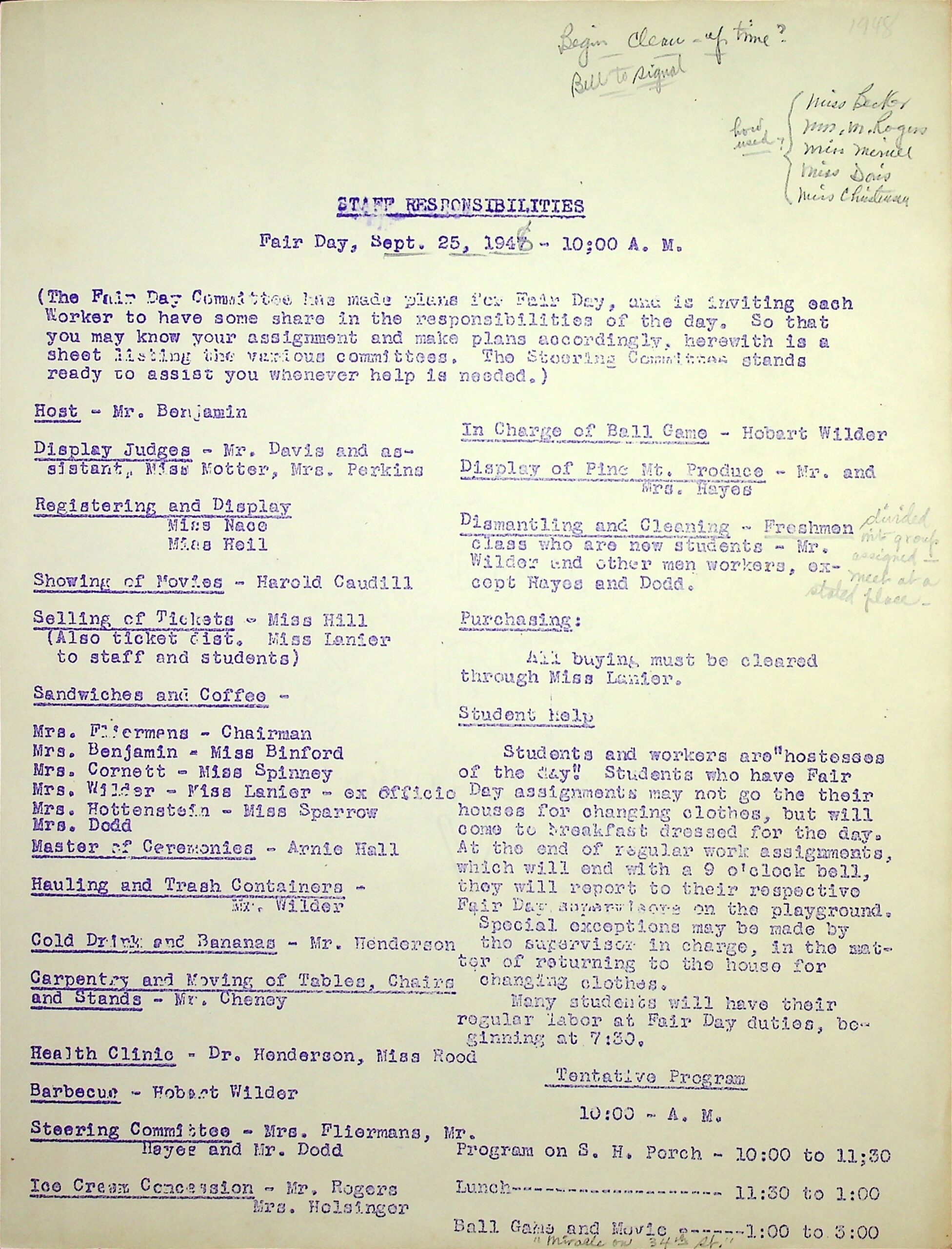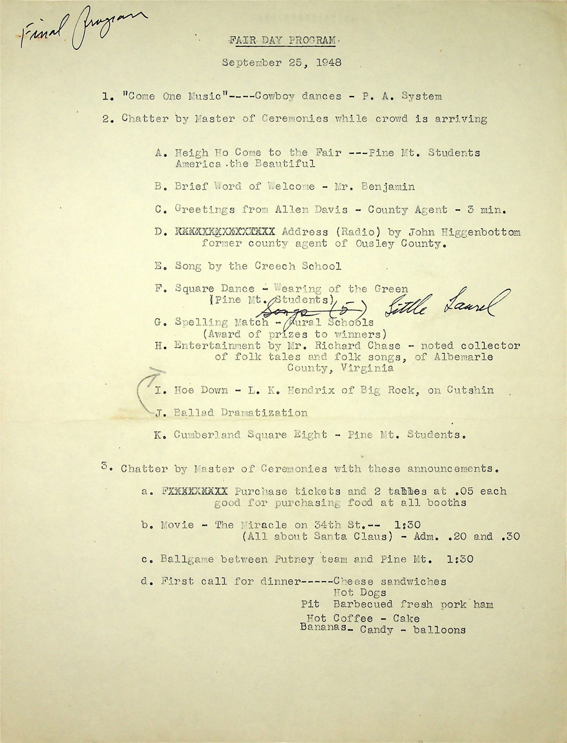 TAGS: 1948 Community Fair Day, Community Fair, community events, fairs, Pine Mountain Settlement School Community, farming, farms, weavings, weaving, embroidery, sewing, canned goods, garden products, poultry, flowers, canning, pickles, Medical Clinic, health check-ups, medicine, barbecue, mutton, beef, pork, ballads ; singing, movies, ball games, calling contests, chicken calling, hog calling, sheep calling, cow calling, prizes, music, educational exhibits, home products, cooking, cakes, honey, breads, corn shuck crafts, crochet, furniture, brooms, soaps, rugs, coverlets, quilts, jellies, jams,