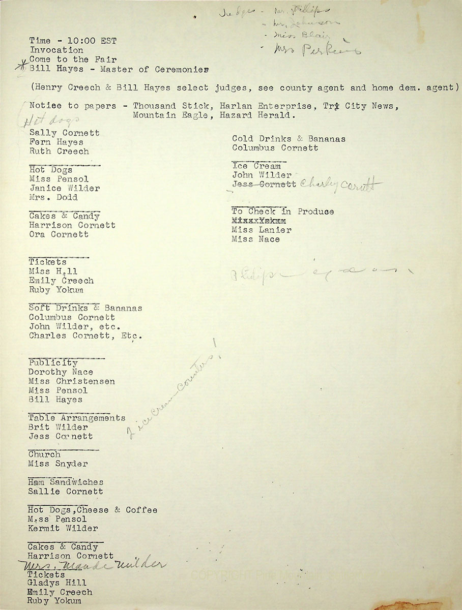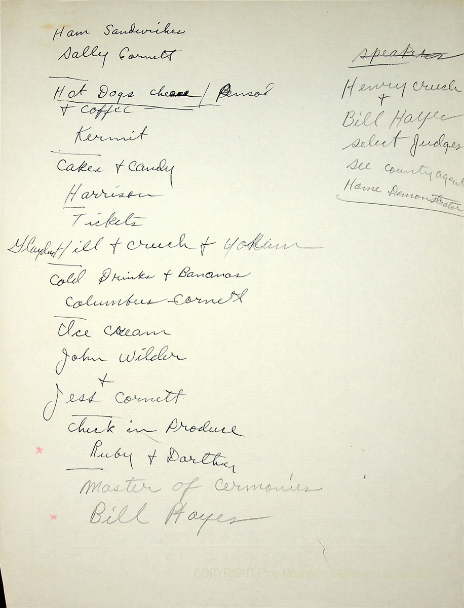 TAGS: 1950 Community Fair Day, agricultural fairs, country fairs, Community Fair Days, Pine Mountain Settlement School, Burton Rogers, home economists, health clinics, Sally Cornett, Kermit Wilder, Gladys Hill, Omeda Holbrook, Ruby Yokum, John Wilder, Jess Cornett, Cumberland Valley Rural Electric Cooperative Corporation, Dorothy Nace, Bill Hayes, Fern Hall Hayes, Henry Creech, agricultural demonstrations, farm produce, foodways, Harlan County churches, ministers, celebrations, dancing, Kentucky Running Set, Janette Blair, Gladys Walden, Harlan County Schools, Mable Snyder, Bear Branch School, Brit Wilder, Alonzo Turner, Chester Jackson, Charlene Wilder, Coyle Branch School, spelling bee, Ruth Lewis, Allen Davis, County Agents, Luther Turner, Arny Hall, H.R.S. Benjamin, Maude Wilder, Otis Lewis, Hoe Downs, Creed Turner, L.K. Hendrix, movies, Dorothy Nace, Burkham School House, playground, ball games, pit barbecue, exhibits, garden produce, weaving, canning, embroidery, R.E.A. Demonstration, Punch and Judy puppets,