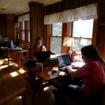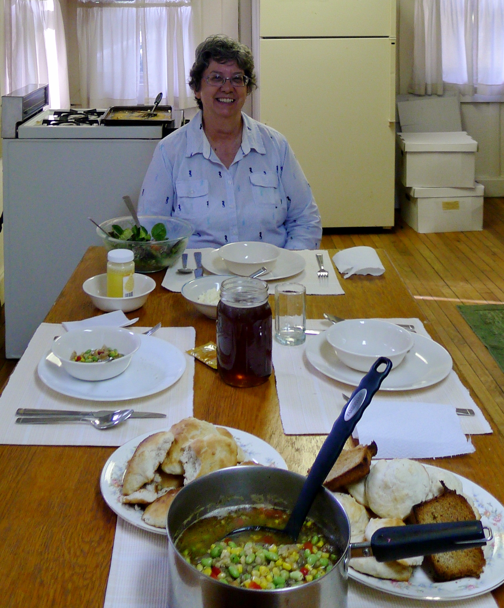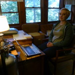 - Anna Smith, community volunteer Librarian who assisted in preparation and follow-up for the two Alpha Sigma Tau work on the PMSS Collections. It’s dinner time at Hill House, 2015. Photo by AAE.