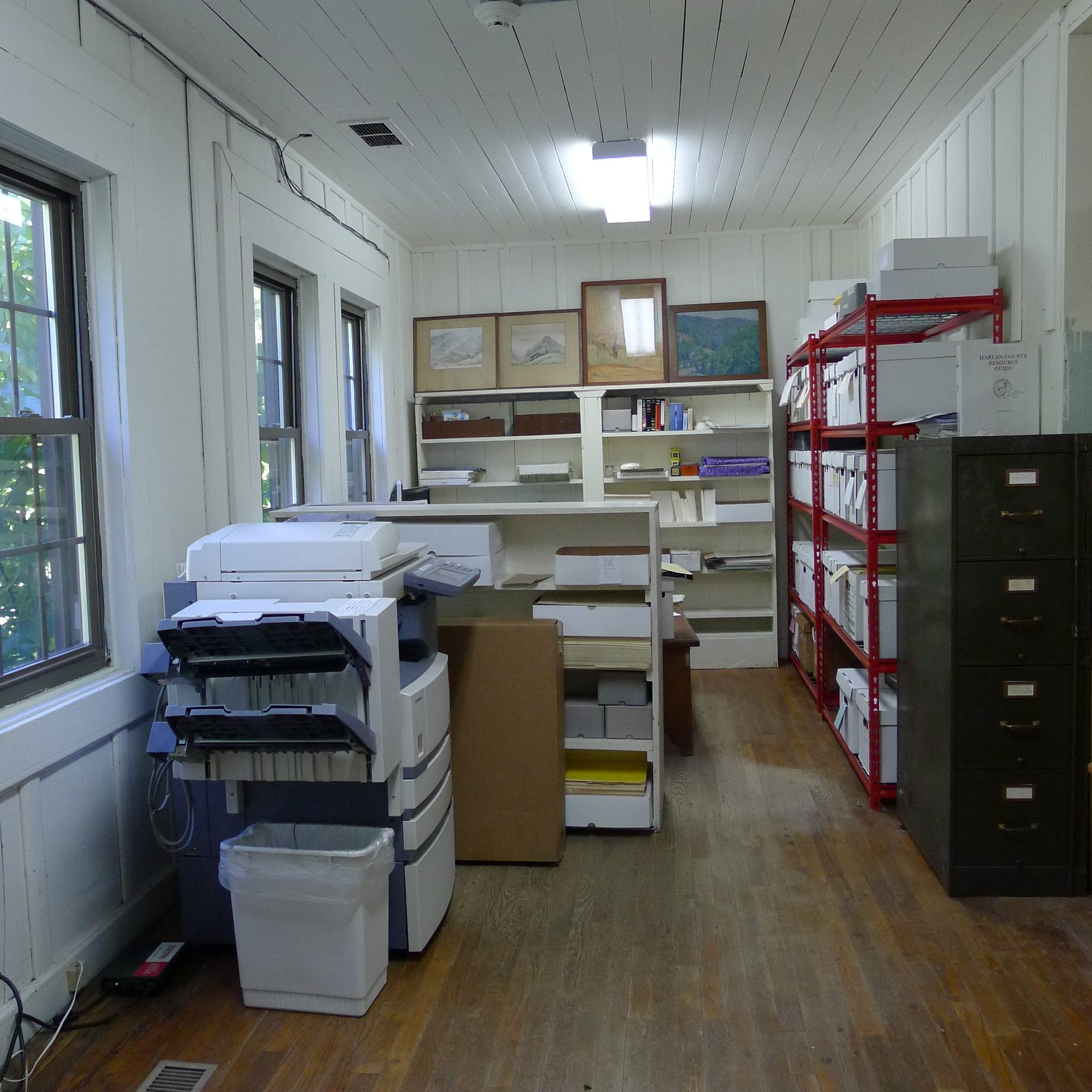 - View from reading room toward processing/work/collections area.Boys House. Archive/Library room.