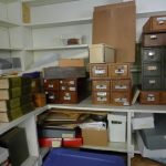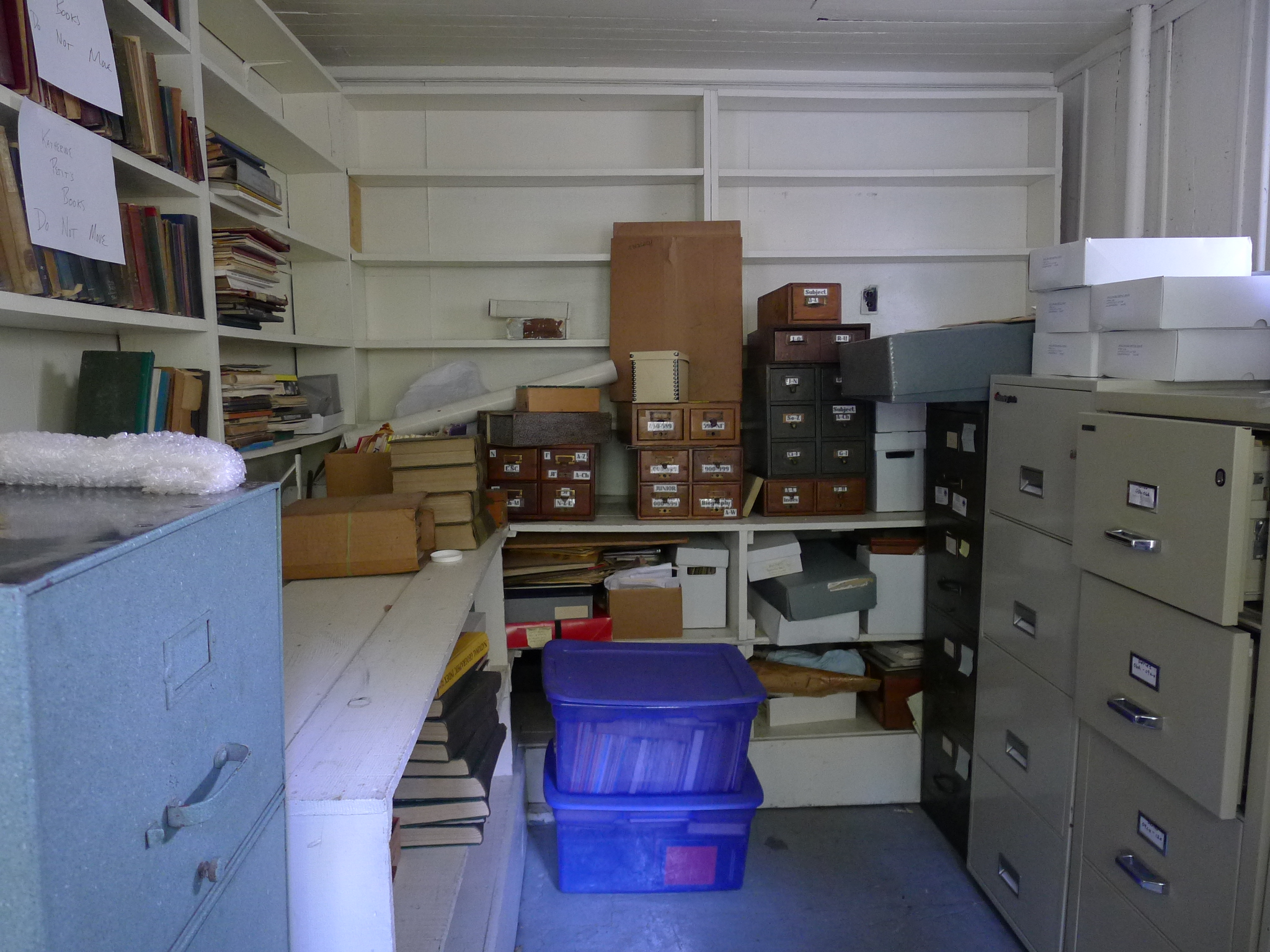 For a time collections that were frequently used, such as photographic collections, were housed in the main Office building where the materials shared space with interns, staff, and were sometimes mixed with records of the operation of various institutional programs, such as the Environmental Education program. It was air-conditioned but it was a vulnerable collection location. The best that could be said about the Office environment was that it was a convenient resource to the administration. While most of the collection in the Office was housed in air-conditoned space, the attic contained records going back to the School’s beginnings in 1913. Attic storage temperatures reached well over 110 degrees most summers and high acid paper rapidly turned to confetti in many of the metal file cabinets. The Office storage was convenient but was also a “brittle” problem.