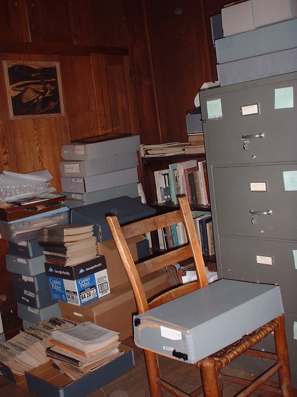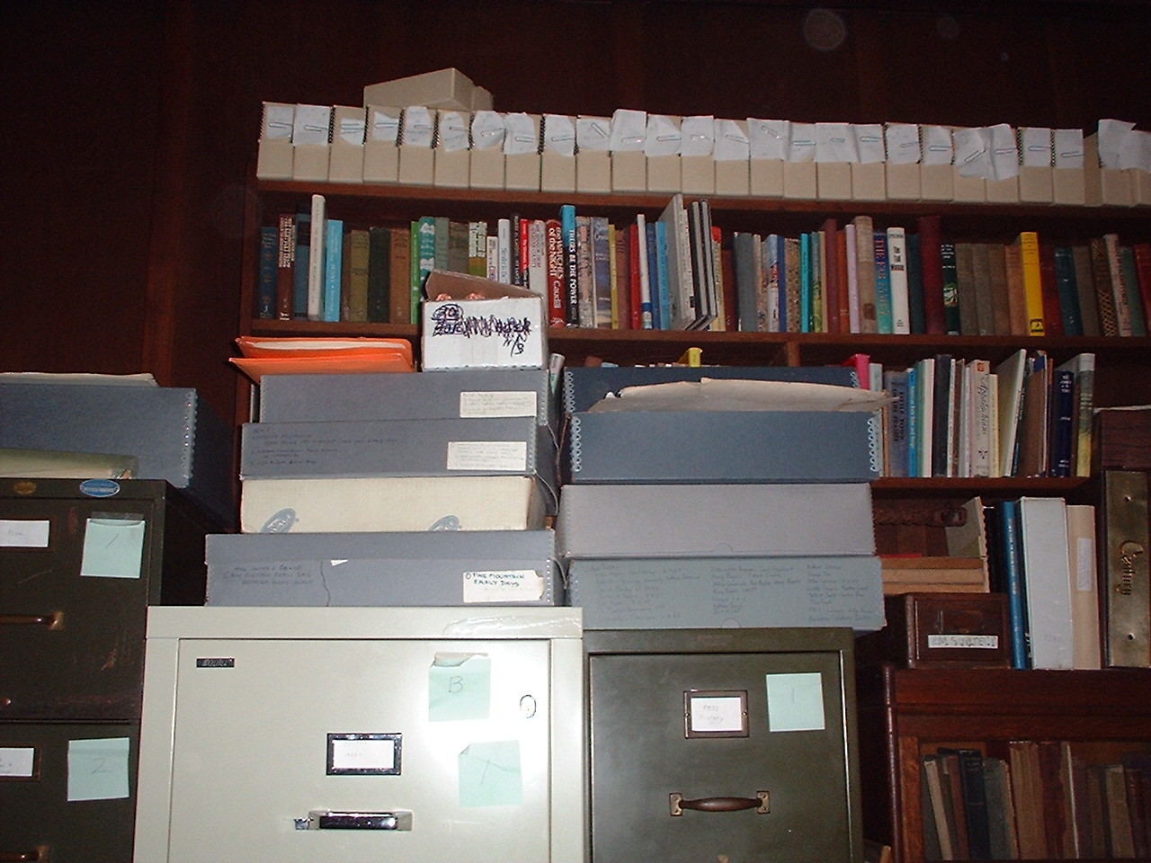 At West Wind, the conditions were neither air-conditioned nor convenient. The rooms that housed the collections were either insect-laden or too moist for long-term storage. For years the financial records were piled high in a room that housed the electrical circuit box for the building and that was often accessed as electrical problems needed to be addressed. The boxes of office records, largely financial, eventually collapsed under their own weight. Unprocessed records of previous Directors were also stacked high or crammed into filing cabinets or mixed with the financial records. The processed records that were part of the Berea College SIA microform project of 1983 were also housed in the same room and were in better condition, but housed in non-archival cartons that were shared with annual lady-bugs.
