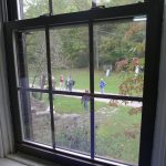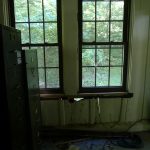 - View of north window with air-conditioner (temporary until full HVAC). Boys House. Archive/Library room.
