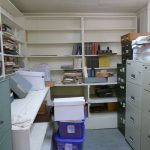 Repair and re-organization also soon began in the large library room that would eventually house the bulk of the archive collections from West Wind and the Office. Old library shelving was removed (too narrow for carton storage) and tall, red metal storage racks added along the walls of the room near the ring-neck snake room. Some old shelving was left intact to house the large book collections from the old library. The circulation shelves were removed and the full space opened up and re-painted.