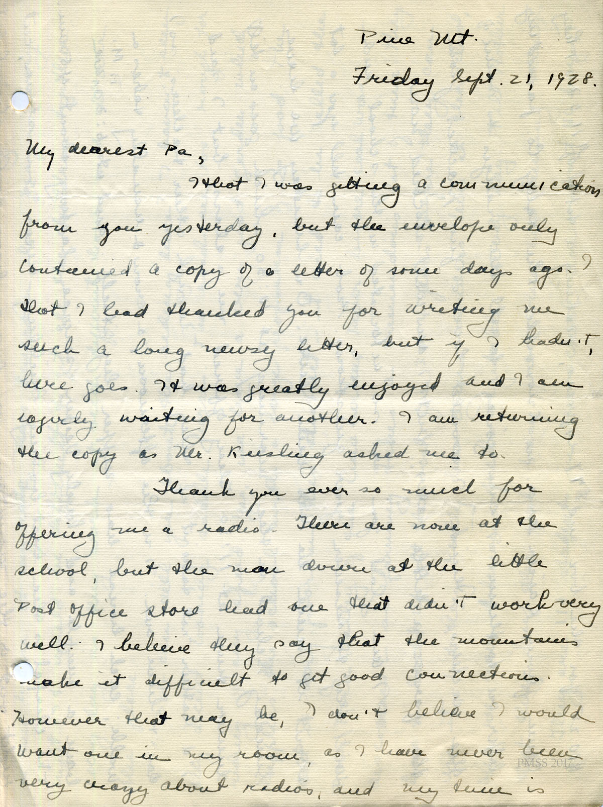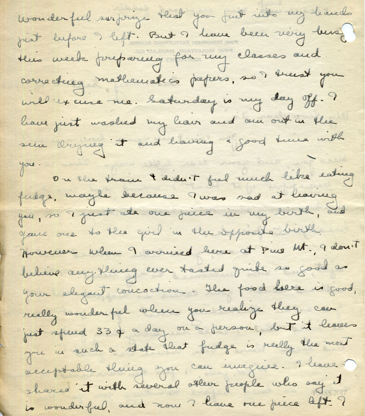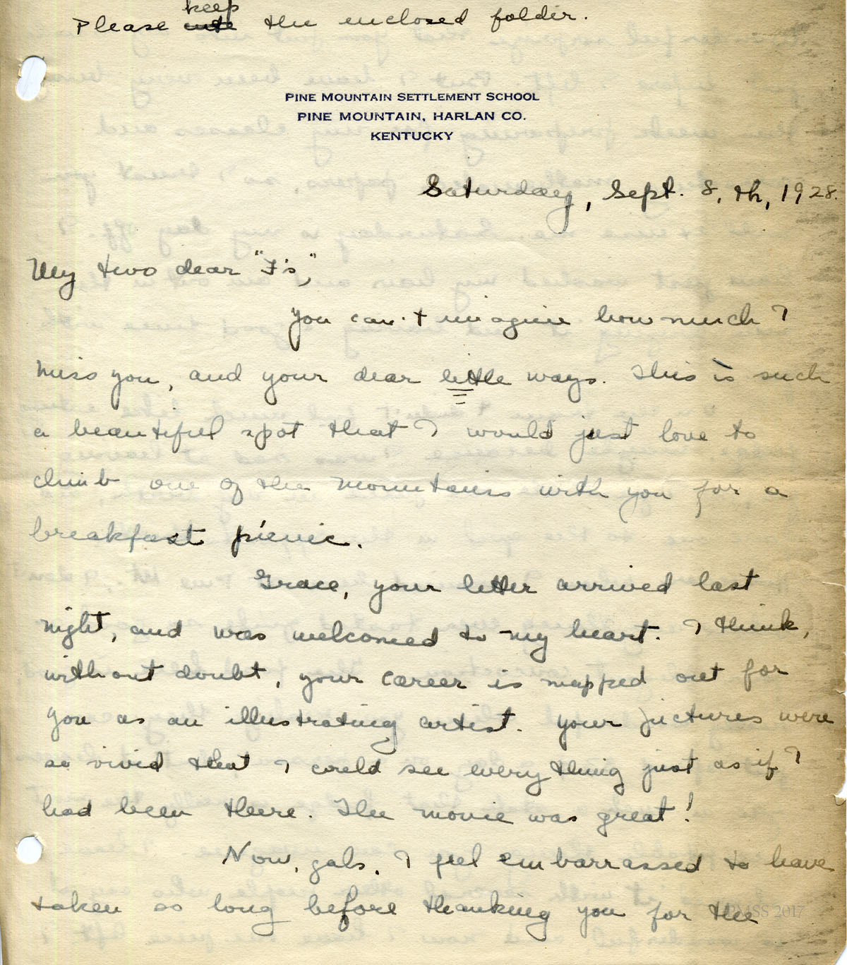 In the summer of 2017 John Orndorff, Harriet Crutchfield’s son, visited Pine Mountain Settlement School and brought along the following “journal” comprised of letters his mother, Harriet, wrote to family and friends during her time as a teacher at Pine Mountain Settlement School. Over 200 pages of Harriet’s observations, reflections, and experiences fill the small black binder. Her son noted when talking with the staff at Pine Mountain that he could think of no better place for the journal to be appreciated. His generosity and his astute assessment of the journal’s importance to Pine Mountain Settlement are profoundly appreciated.