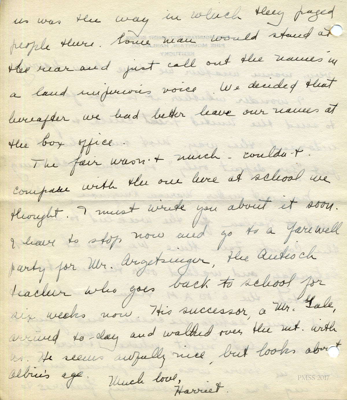 Harriet and her family developed and held a deep affection for Pine Mountain and Kentucky where their roots ran deep. Though Harriet was at Pine Mountain for only two school years, her father’s service on the Board of Trustees and Harriet’s later service on the Pine Mountain Advisory Board, extended the family’s connection. The entire family became strong supporters of Pine Mountain and its mission. Harriet continued to keep up her correspondence and contributions to the School until ill health in the 1980s limited her activity.