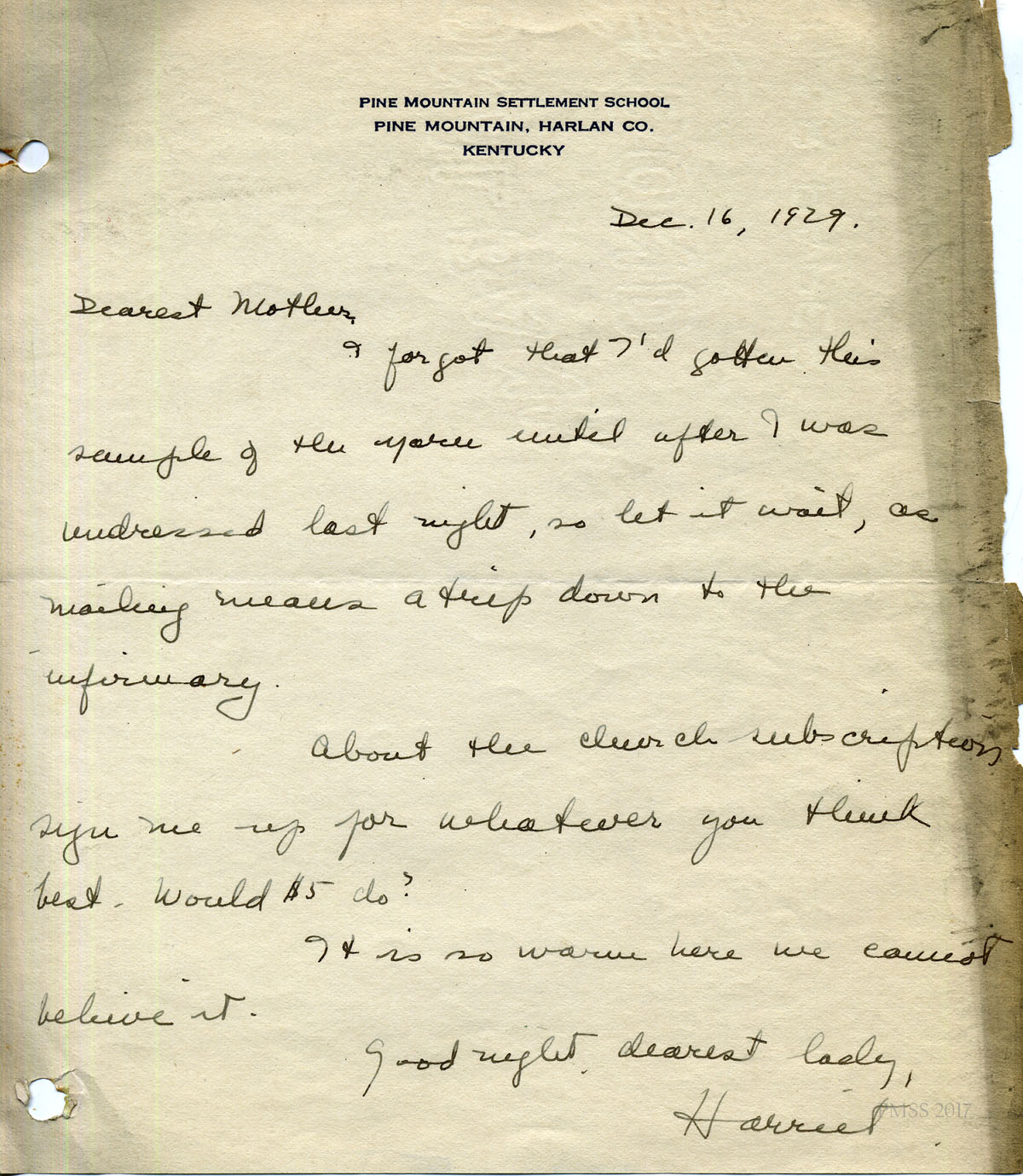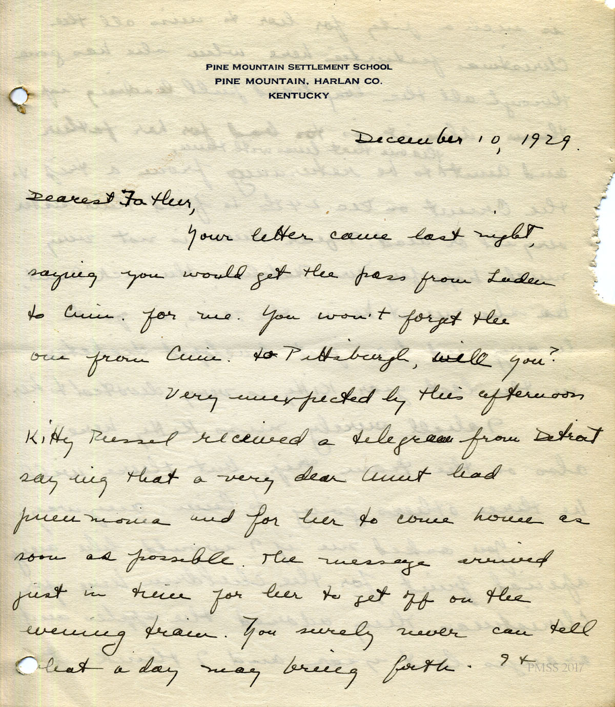 In the summer of 2017 John Orndorff, Harriet Crutchfield’s son, visited Pine Mountain Settlement School and brought along the following “journal” comprised of letters his mother, Harriet, wrote to family and friends during her time as a teacher at Pine Mountain Settlement School. Over 200 pages of Harriet’s observations, reflections, and experiences fill the small black binder. Her son noted when talking with the staff at Pine Mountain that he could think of no better place for the journal to be appreciated. His generosity and his astute assessment of the journal’s importance to Pine Mountain Settlement are profoundly appreciated.