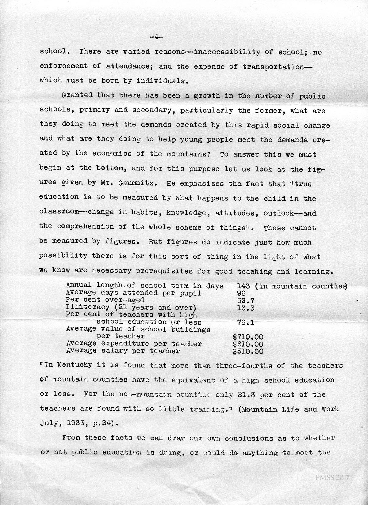Gaumnitz, Walter H., ” Extent and Nature of Public Education in the Mountains,” Mountain Life and Work (Conference Proceedings) — Vol 09, n.2 July 1933. p.20 —