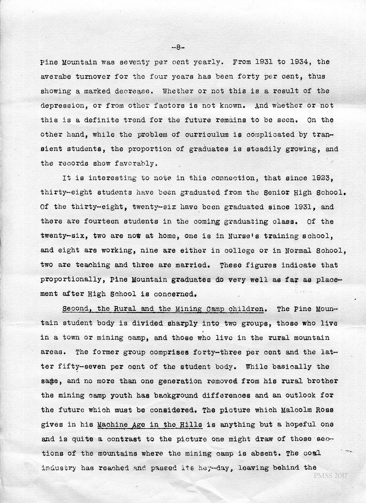 Second, the Rural and the Mining Camp children. The Pine Mountain student body is divided sharply into two groups, those who live in a town or mining camp, and those who live in the rural mountain areas. The former group comprises forty-three percent and the latter fifty-seven percent of the student body. While basically the same, and no more than one generation removed from his rural brother the mining camp youth has background differences and an outlook for the future which must be considered. The picture which Malcolm Ross gives in his Machine Age in the Hills is anything but a hopeful one and is quite a contrast to the picture one might draw of those sections of the mountains where the mining camp is absent. The coal industry has reached and passed its hey-day, leaving behind the …