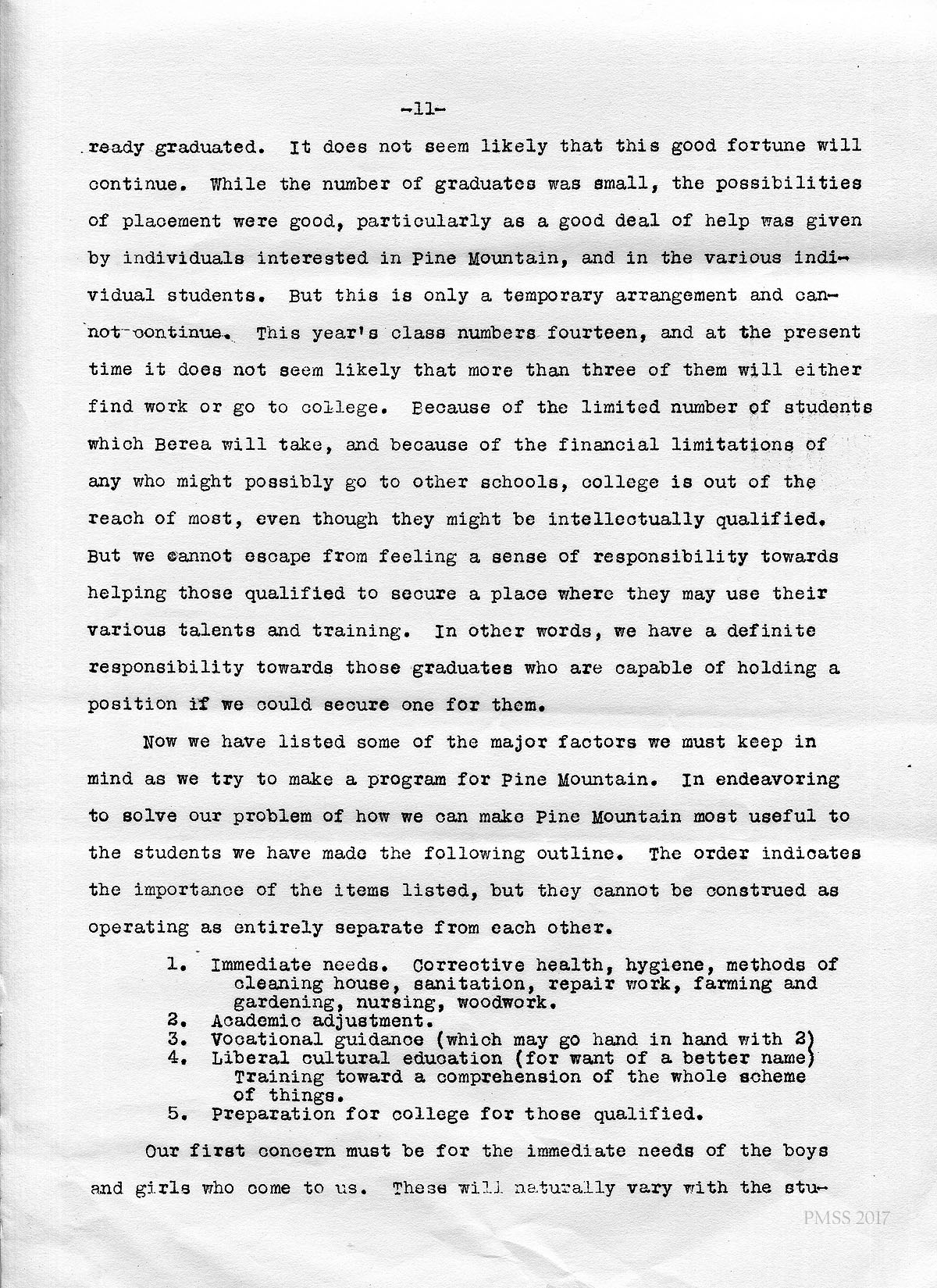 Now we have listed some of the major factors we must keep in mind as we try to make a program for Pine Mountain. In endeavoring to solve our problem of how we can make Pine Mountain most useful to the students we have made the following outline. The order indicates the importance of the items listed, but they cannot be construed as operating as entirely separate from each other.