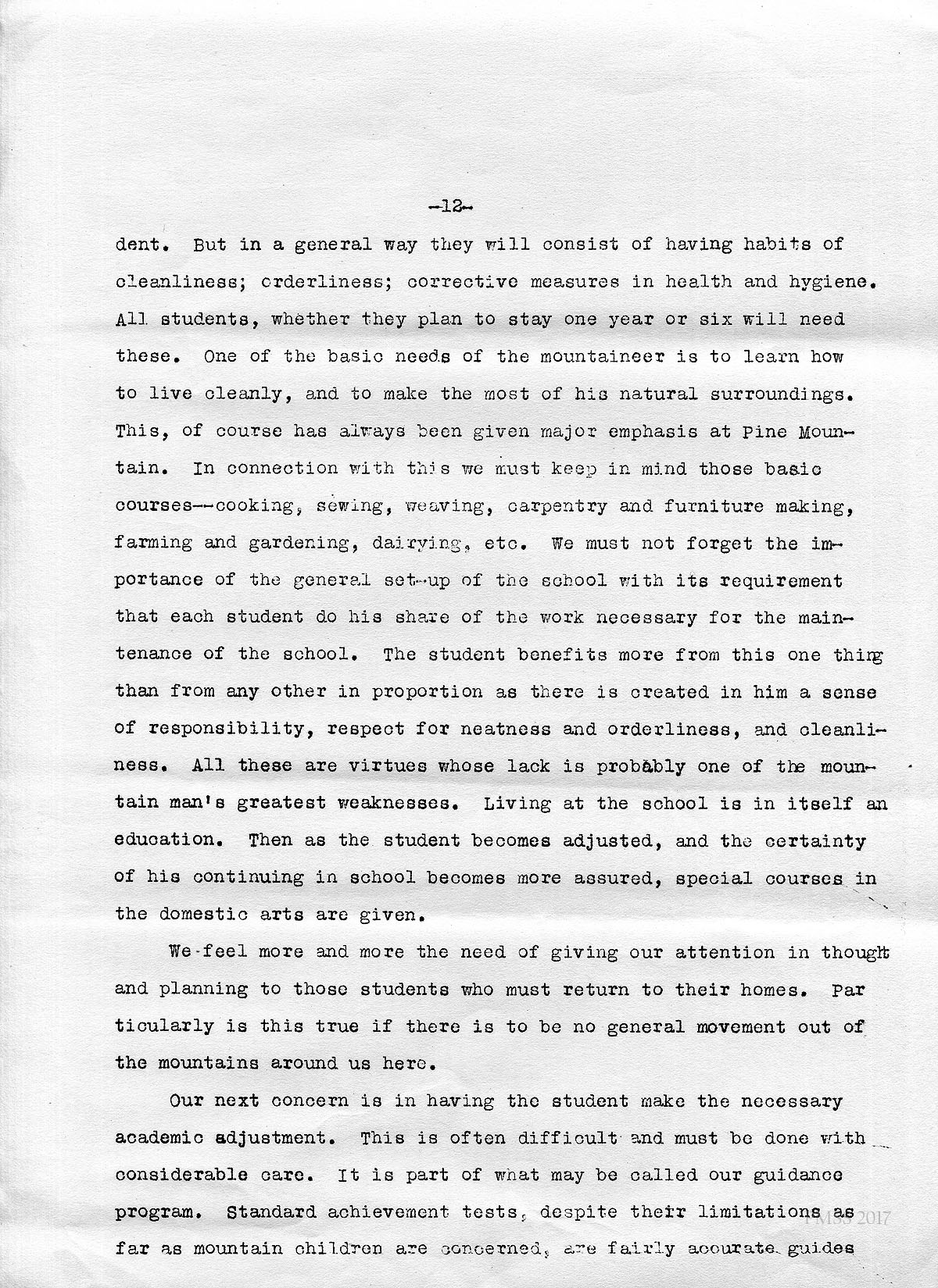 In this connection, it is well to say that we are making a definite effort to take as new students those who are ready for the seventh grade, rather than any above. We find it less difficult to remedy habits, and easier to instill the Pine Mountain philosophy into the younger students. Then too, they have a chance to stay here for [a] longer time, thus making our work surer. Furthermore, since the school is committed to a policy which emphasizes industrial training, homemaking, vocations, etc., and makes academic training secondary, the question raised by taking younger children may be overlooked. It is not so much a matter of taking only those children who cannot get to another school as of giving a specialized type of training to any mountain youth.