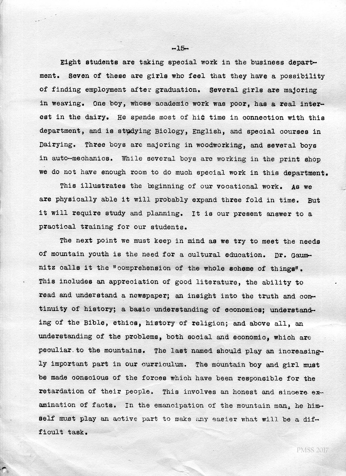 their own problems; where they may be trained in the essentials of leadership; where they may be given opportunity for the specialized training needed for a better life in the mountains, and where they may be given an opportunity for vocational guidance and training in preparation for what we hope will be a brighter industrial era in the hills.