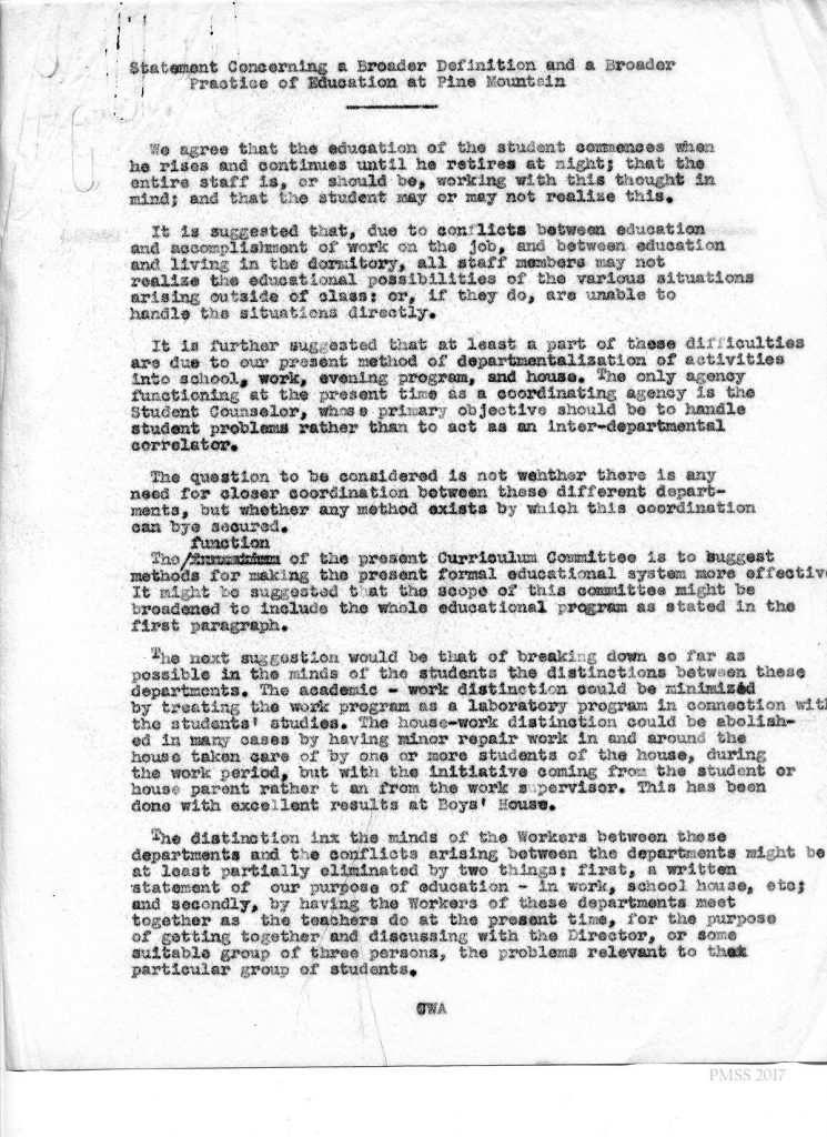 [Student] Statement Concerning a Broader Definition and a Broader Practice of Education at Pine Mountain