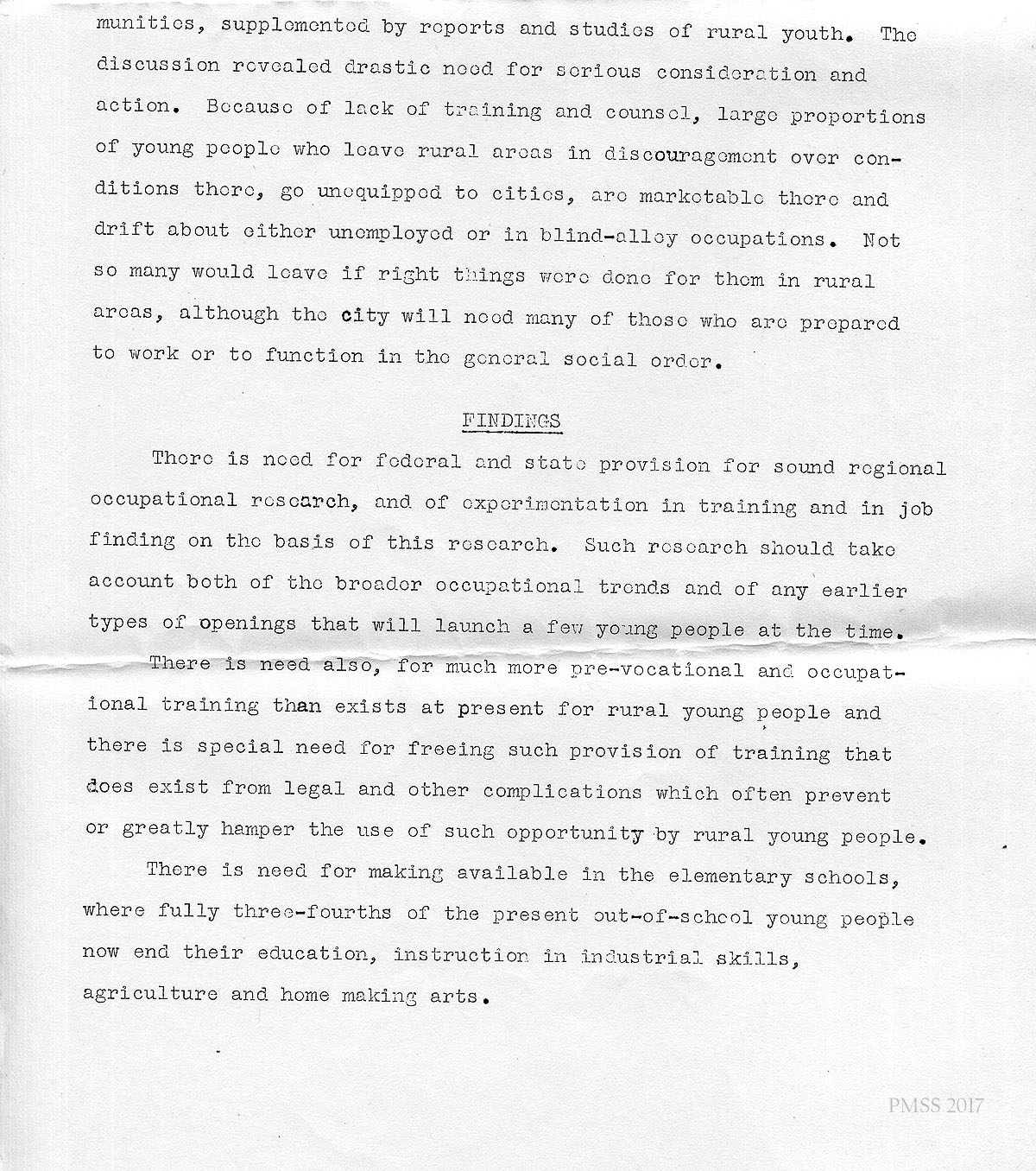 Discussion with youth and adults of respective rural communities, supplemented by reports and studies of rural youth. The discussion revealed a drastic need for serious consideration and action. Because of lack of training and counsel, large proportions of young people who leave rural areas in discouragement over conditions there, go unequipped to cities, are [not] marketable there and drift about either unemployed or in blind-alley occupations. Not so many would leave if right things were done for them in rural areas, although the city will need many of those who are prepared to work or to function in the general social order.