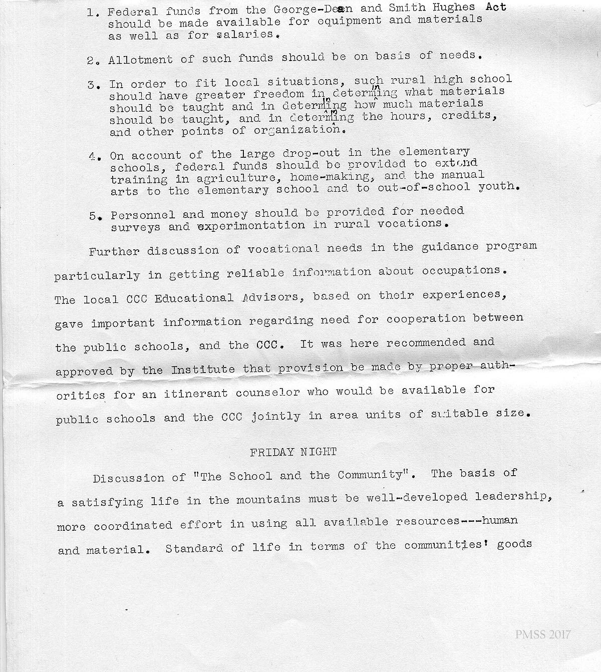 Further discussion of vocational needs in the guidance program particularly in getting reliable information about occupations. The local CCC Educational Advisors, based on their experiences, gave important information regarding the need for cooperation between the public schools, and the CCC. It was here recommended and approved by the Institute that provision be made by proper authorities for an itinerant counselor who would be available for public schools and the CCC jointly in area units of suitable size.