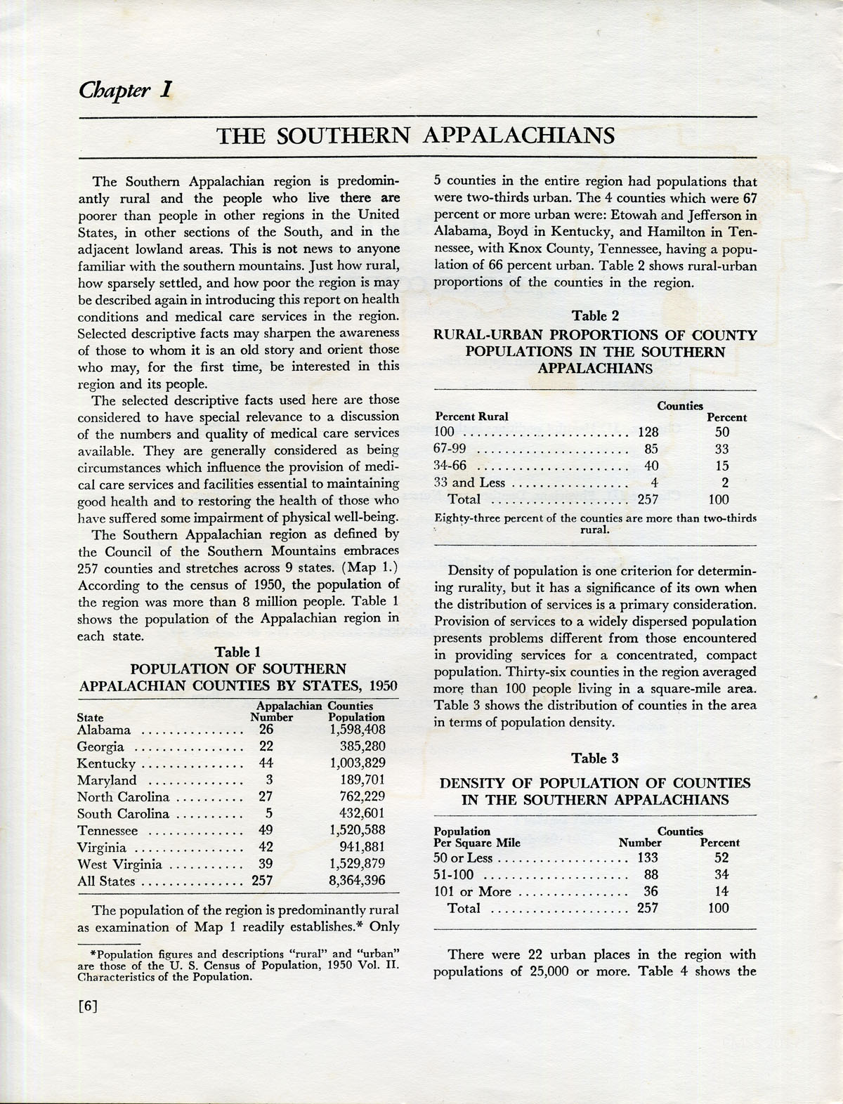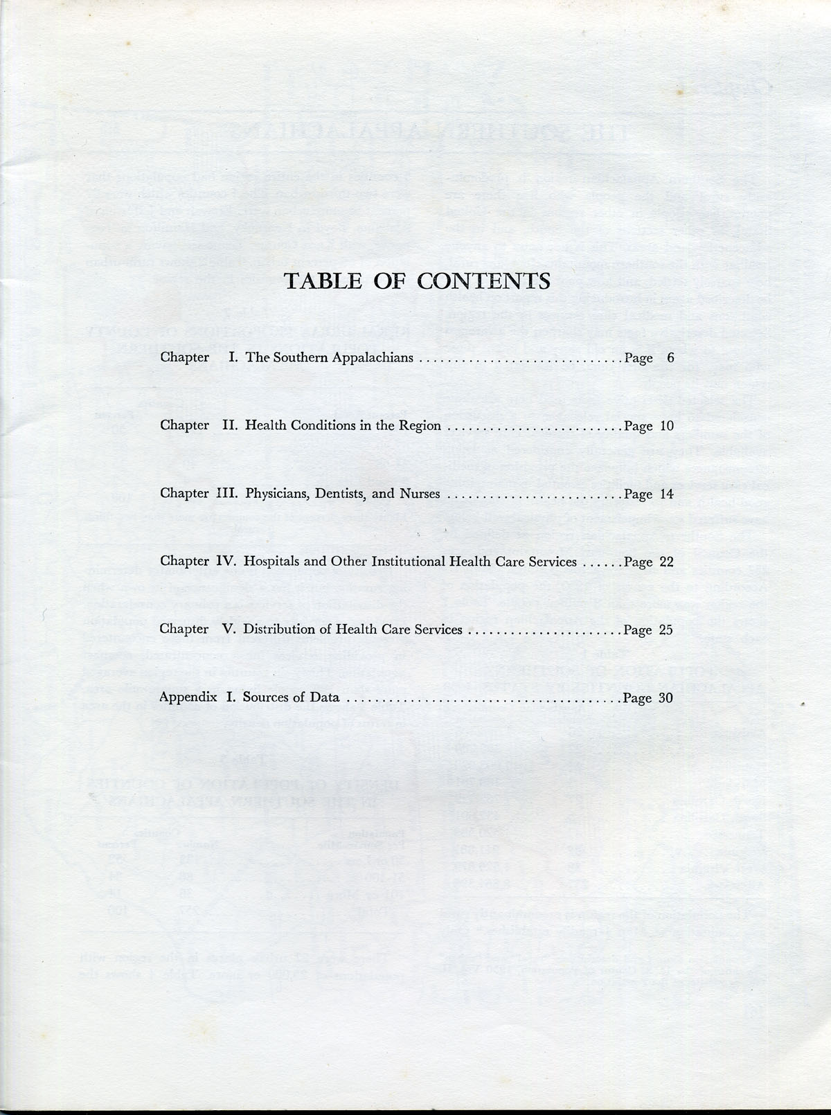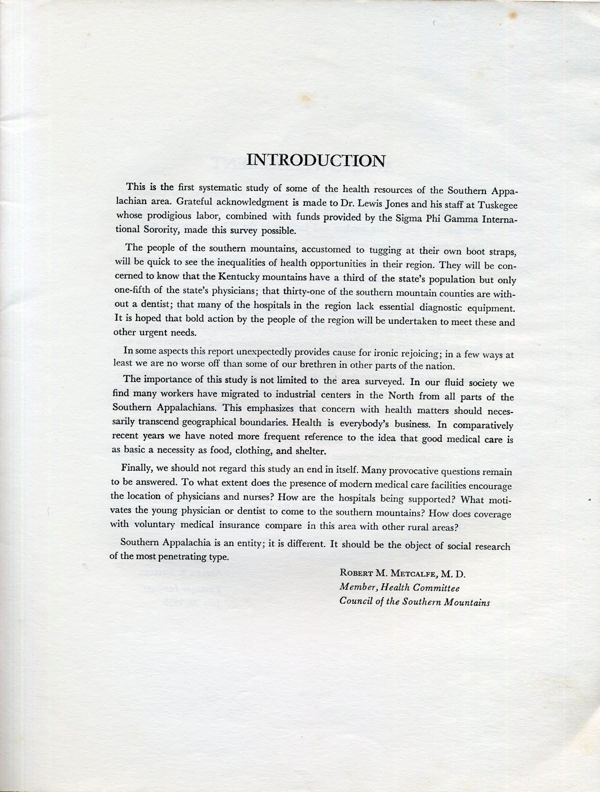 “The Council is pleased to make this survey [on health care services and facilities, 1955] available to all who have an interest in health problems. In addition to the information summarized in this printed report, statistical details for each of the 257 counties in the nine states area are available in the files of the Council of the Southern Mountains.”