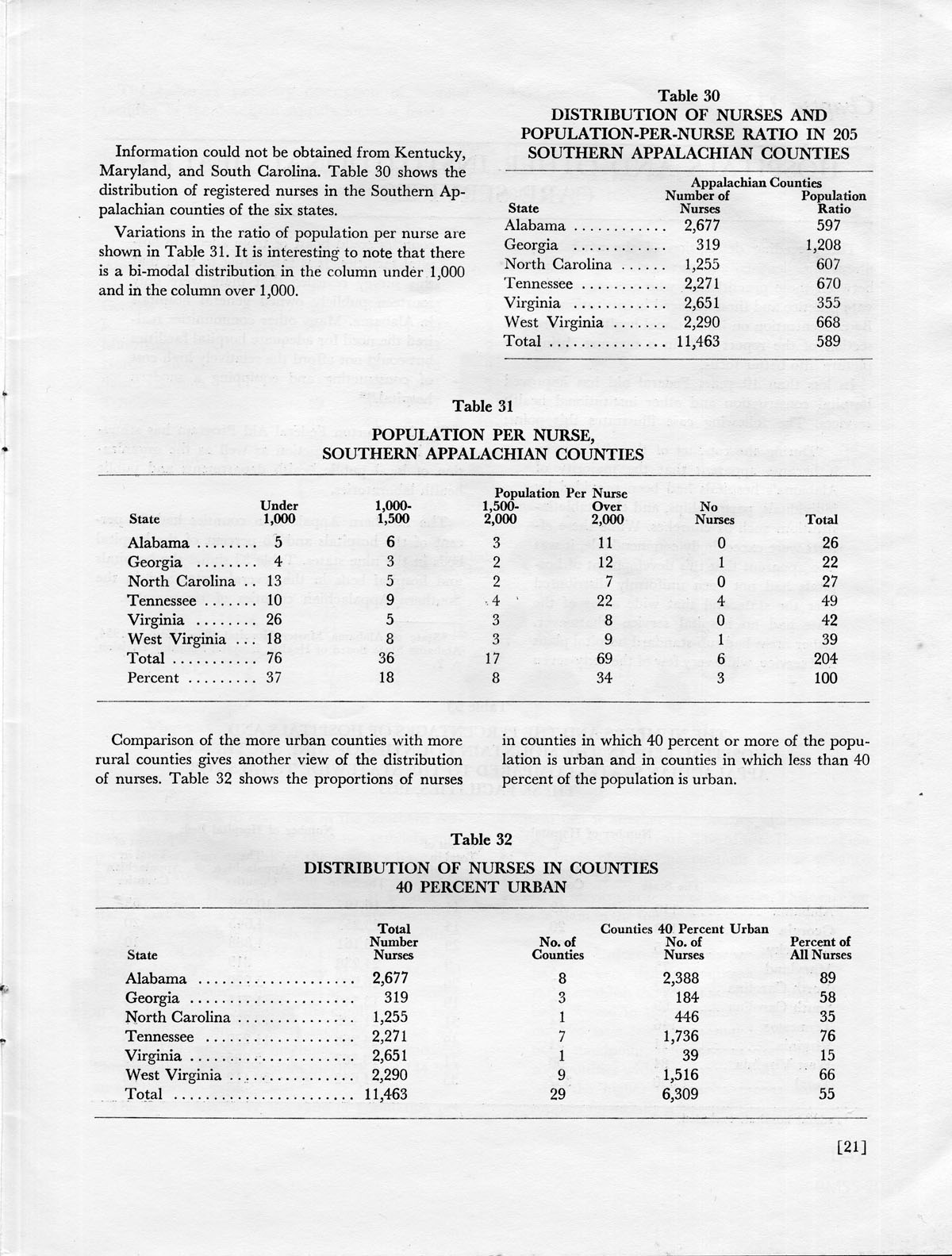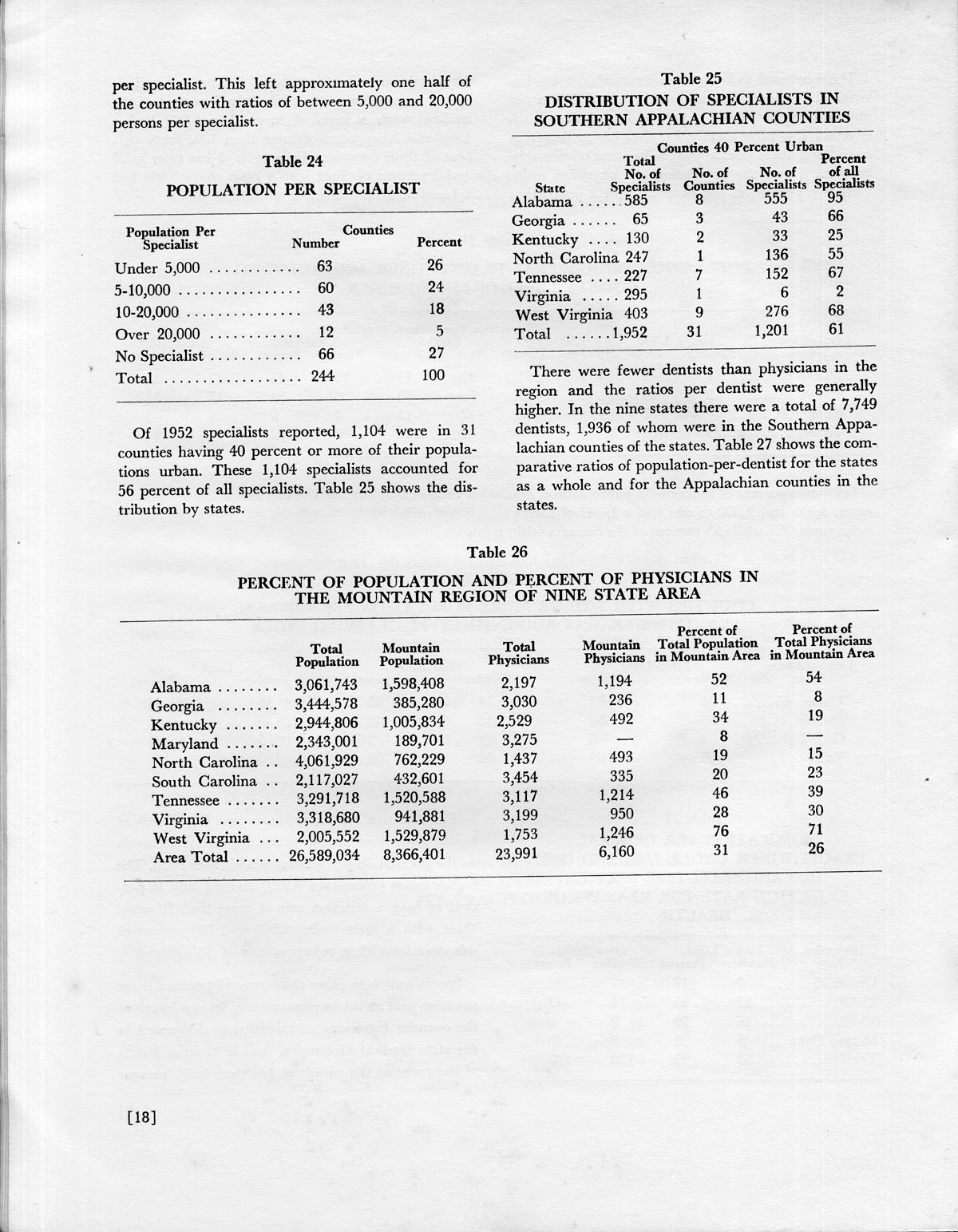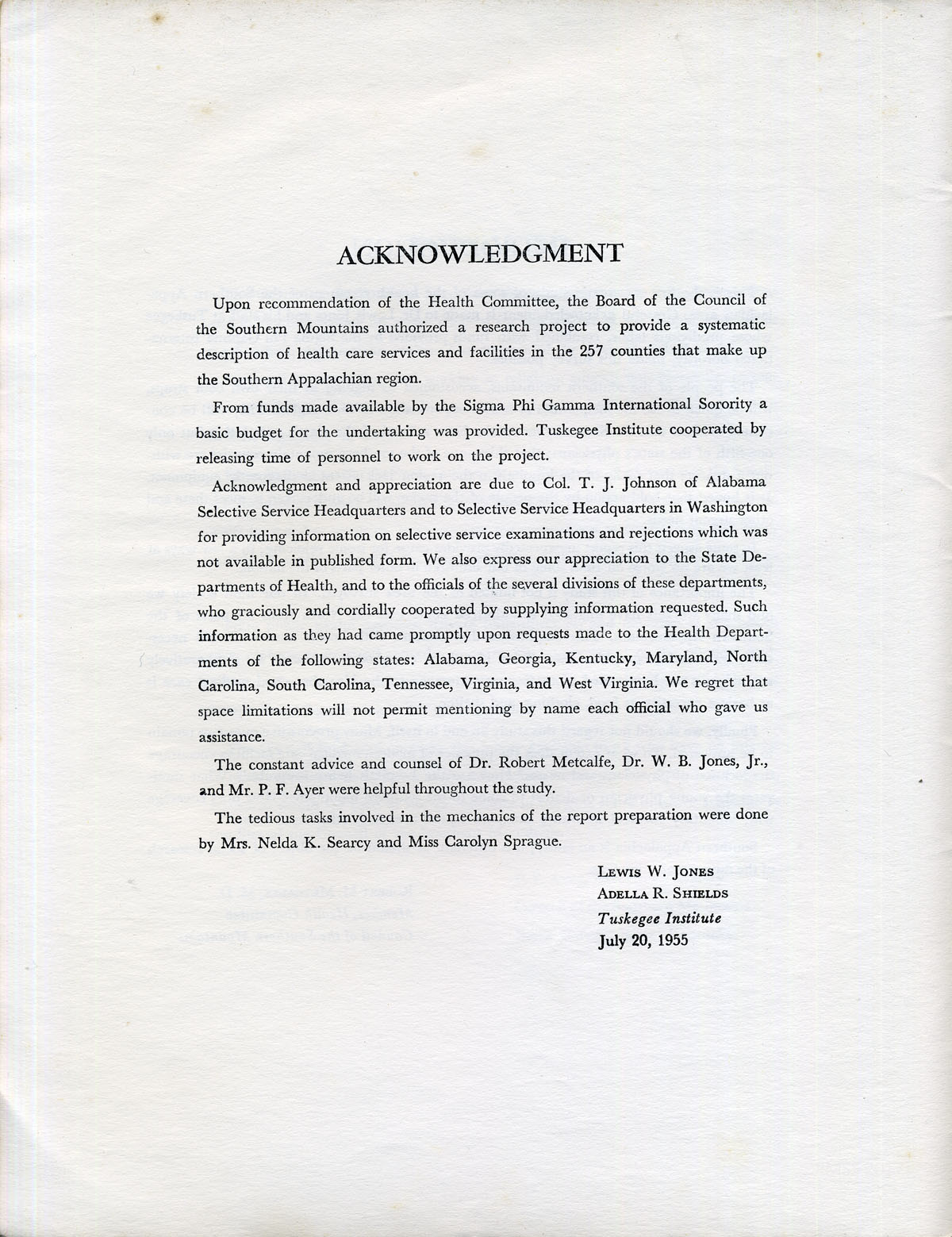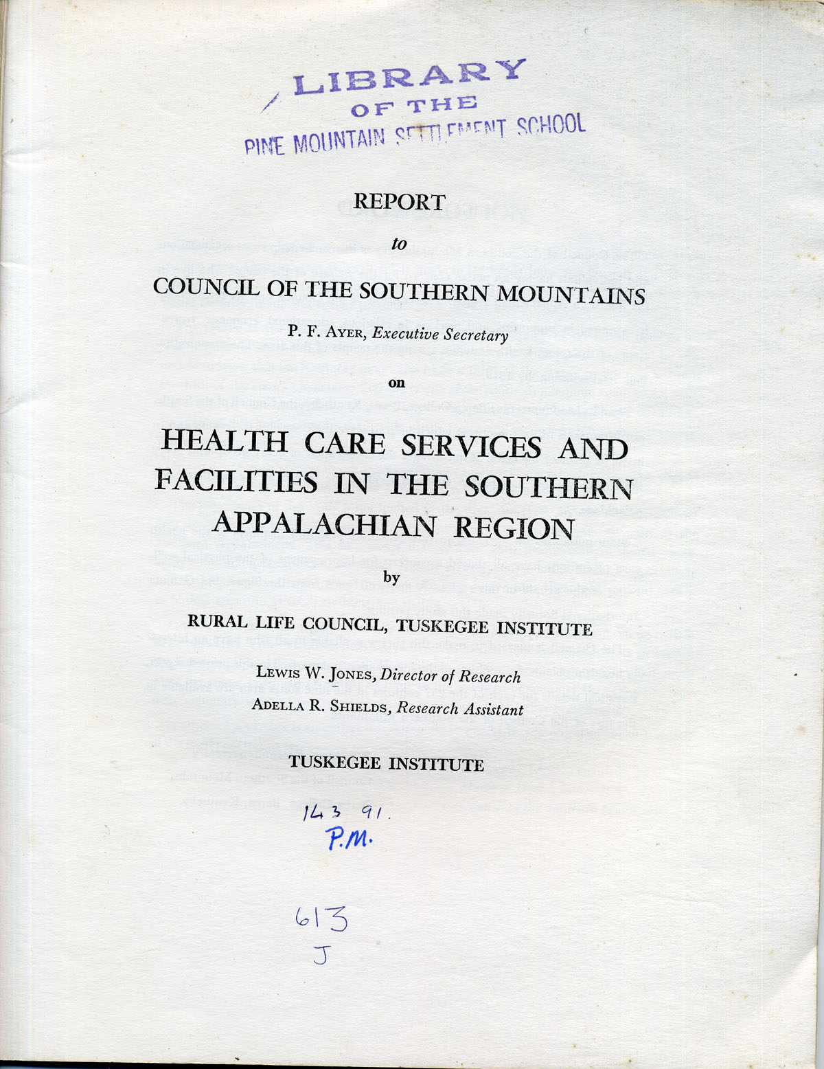 TAGS: Appalachian region; health services; health facilities; Southern Appalachians; Council of the Southern Mountains; Perly F. Ayer; Tuskegee Institute; Adella Shields; Lewis W. Jones; 1955; hospitals; physicians; dentists; nurses;