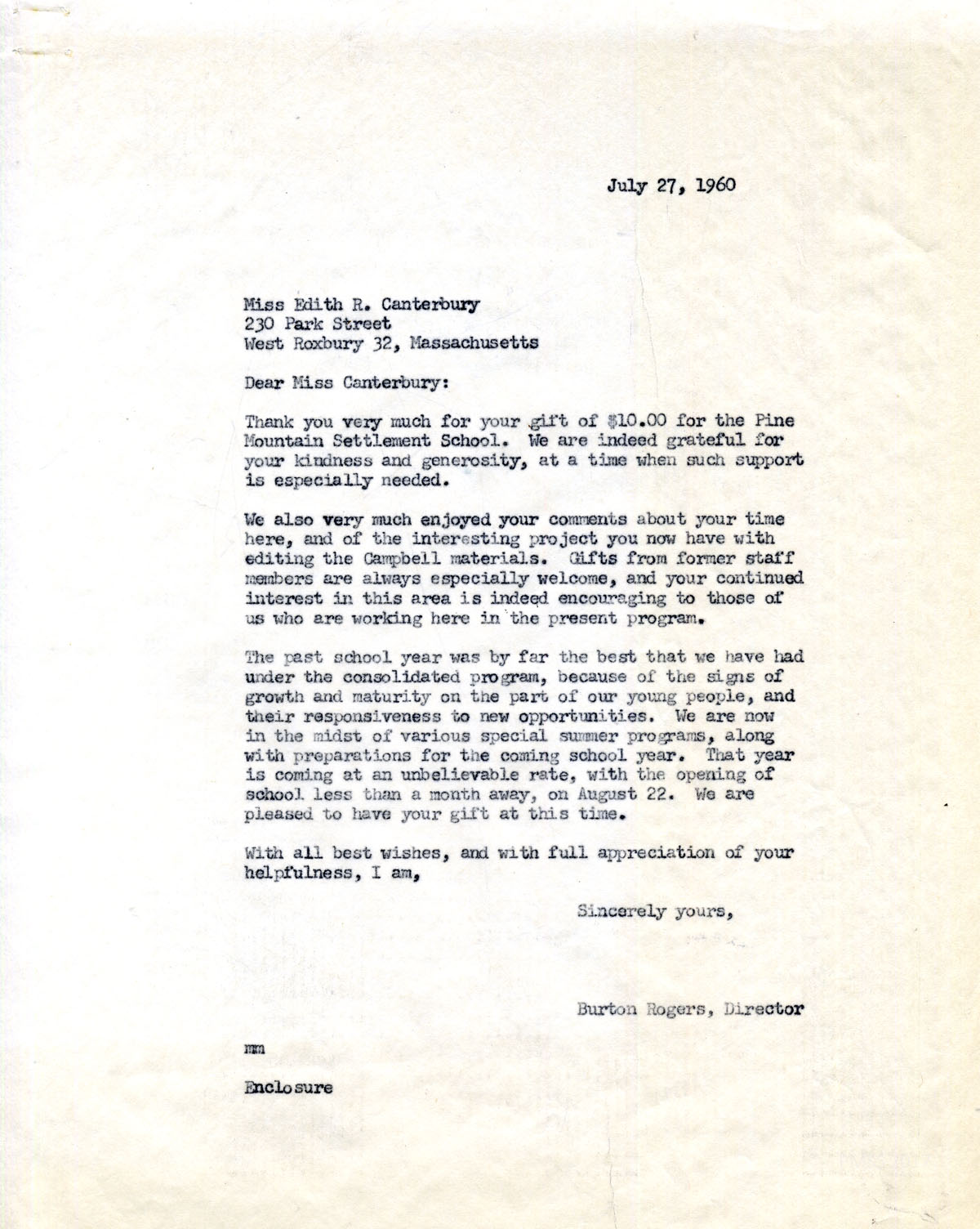 Thank you very much for the lovely gift of $10.00 for the Pine Mountain Settlement School. It is more encouraging than you perhaps realize, as we are trying to come to a balanced budget for the end of the fiscal year. It is such thoughtfulness and generosity which make Pine Mountain possible, and we are grateful.