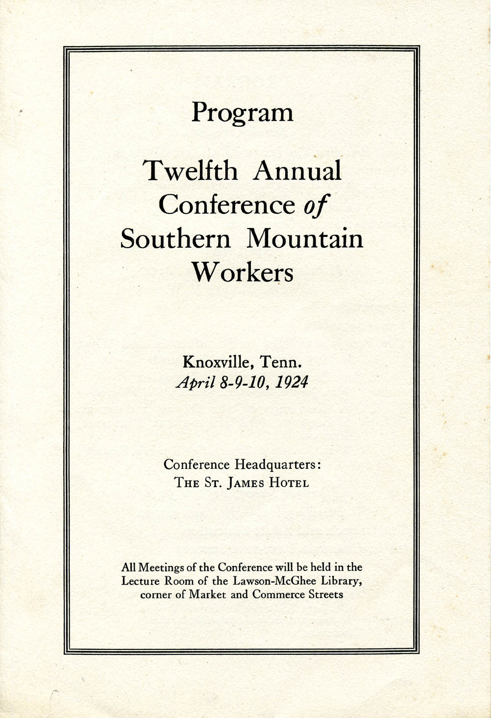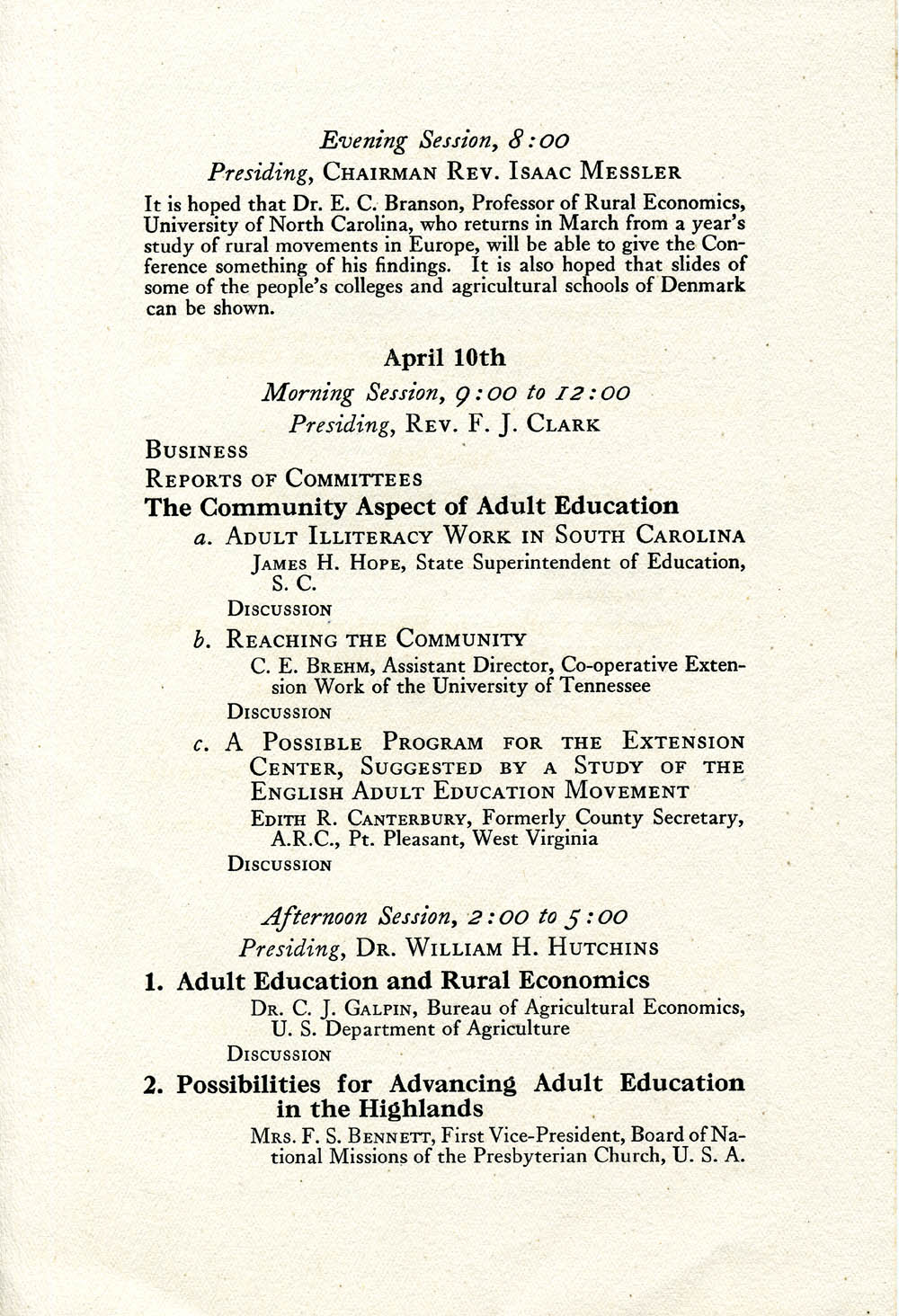- William Hutchins, President of Berea who was on the Board of the Southen Mountain Workers chaired a session of the 12th Annual conference of Southern Mountain Workers in Knoxville, Tennesse in April of 1924. Edith Canterbury presented a paper at that conference. Her offering, “A Possible Program for the Extension Center, Suggested by the Study of the English Adult Education Movement,” is found below. She is listed in the 1924 program as “Formerly County Secretary A.R.C., Pt. Pleasant, West Virginia.”