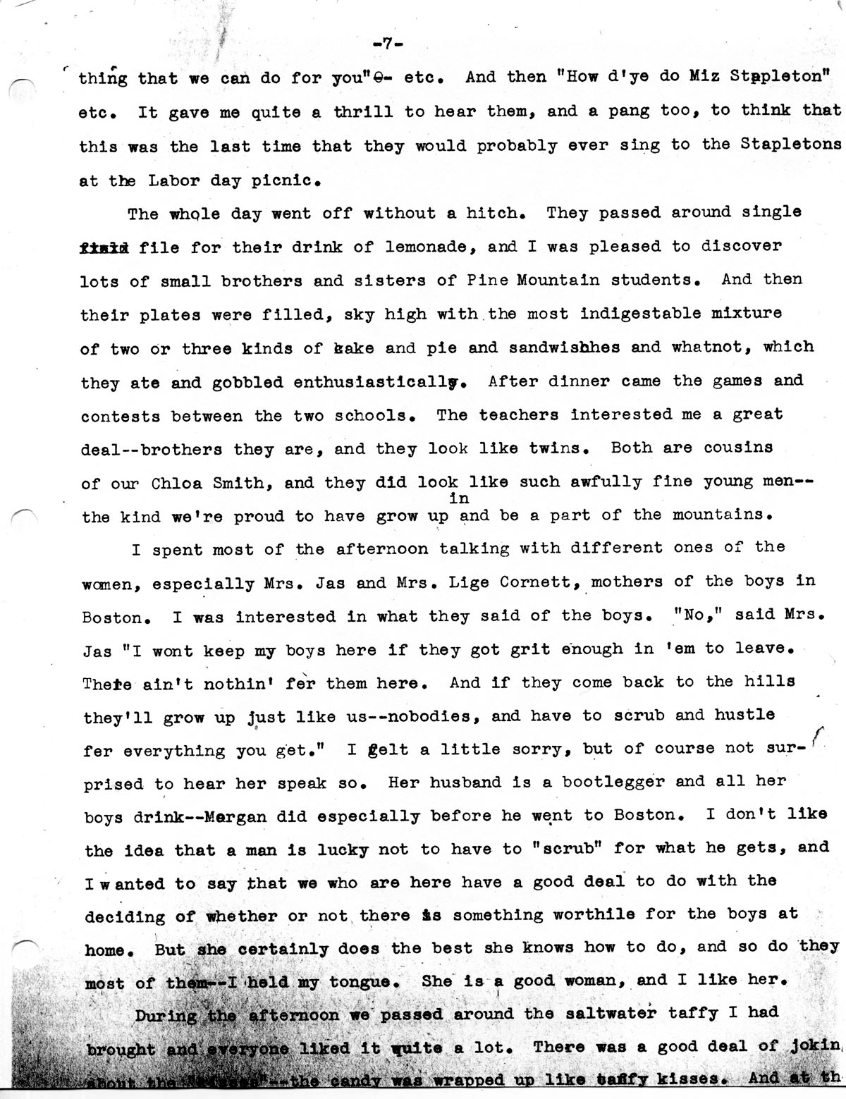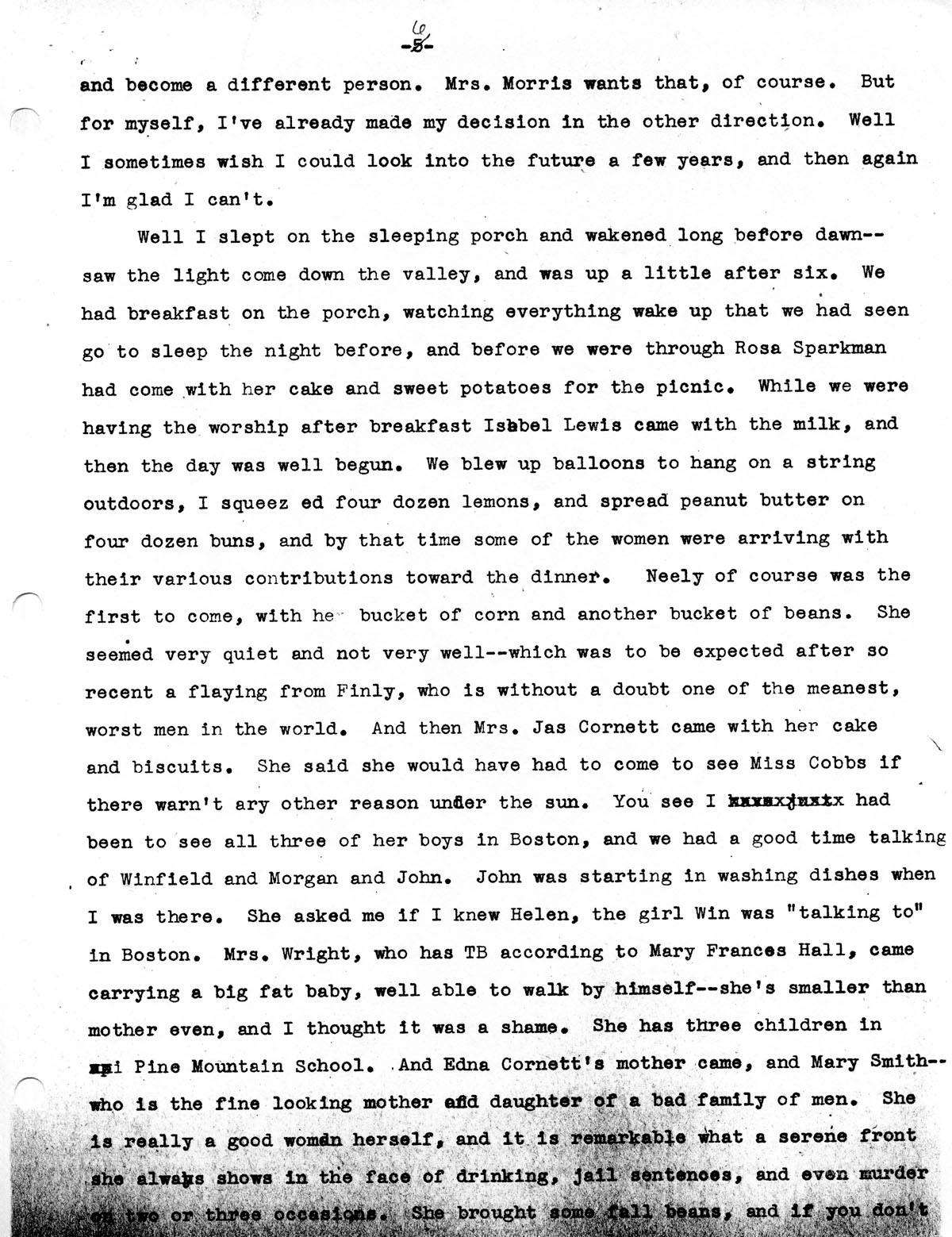 Well I slept on the sleeping porch and wakened long before dawn — saw the light come down the valley, and was up a little after six. We had breakfast on the porch, watching everything wake up that we had seen go to sleep the night before, and before we were through Rosa Sparkman had come with her cake and sweet potatoes for the picnic. While we were having the worship after breakfast Isabel Lewis came with the milk, and then the day was well begun. We blew up balloons to hang on a string outdoors, I squeezed four dozen lemons, and spread peanut butter on four dozen buns, and by that time some of the women were arriving with their various contributions toward the dinner. Neely of course was the first to come, with the bucket of corn and another bucket of beans. She seemed very quiet and not very well — which was to be expected after so recent a flaying from Finly, who is without a doubt one of the meanest, worst men in the world. And then Mrs. Jas Cornett came with her cake and biscuits. She said she would have had to come to see Miss Cobbs if there warn’t ary other reason under the sun. You see I had been to see all three of her boys in Boston, and we had a good time talking of Winfield and Morgan and John. John was starting in washing dishes when I was there. She asked me if I knew Helen, the girl Win was “talking to” in Boston. Mrs. Wright, who has TB according to Mary Frances Hall, came carrying a big fat baby, well able to walk by himself —she’s smaller than mother even, and I thought it was a shame. She has three children in Pine Mountain School. And Edna Cornett‘s mother came, and Mary Smith — who is the fine looking mother and daughter of a bad family of men. She is really a good woman herself, and it is remarkable what a serene front she always shows in the face of drinking, jail sentences, and even murder on two or three occasions. She brought some fall beans, and if you don’t…
