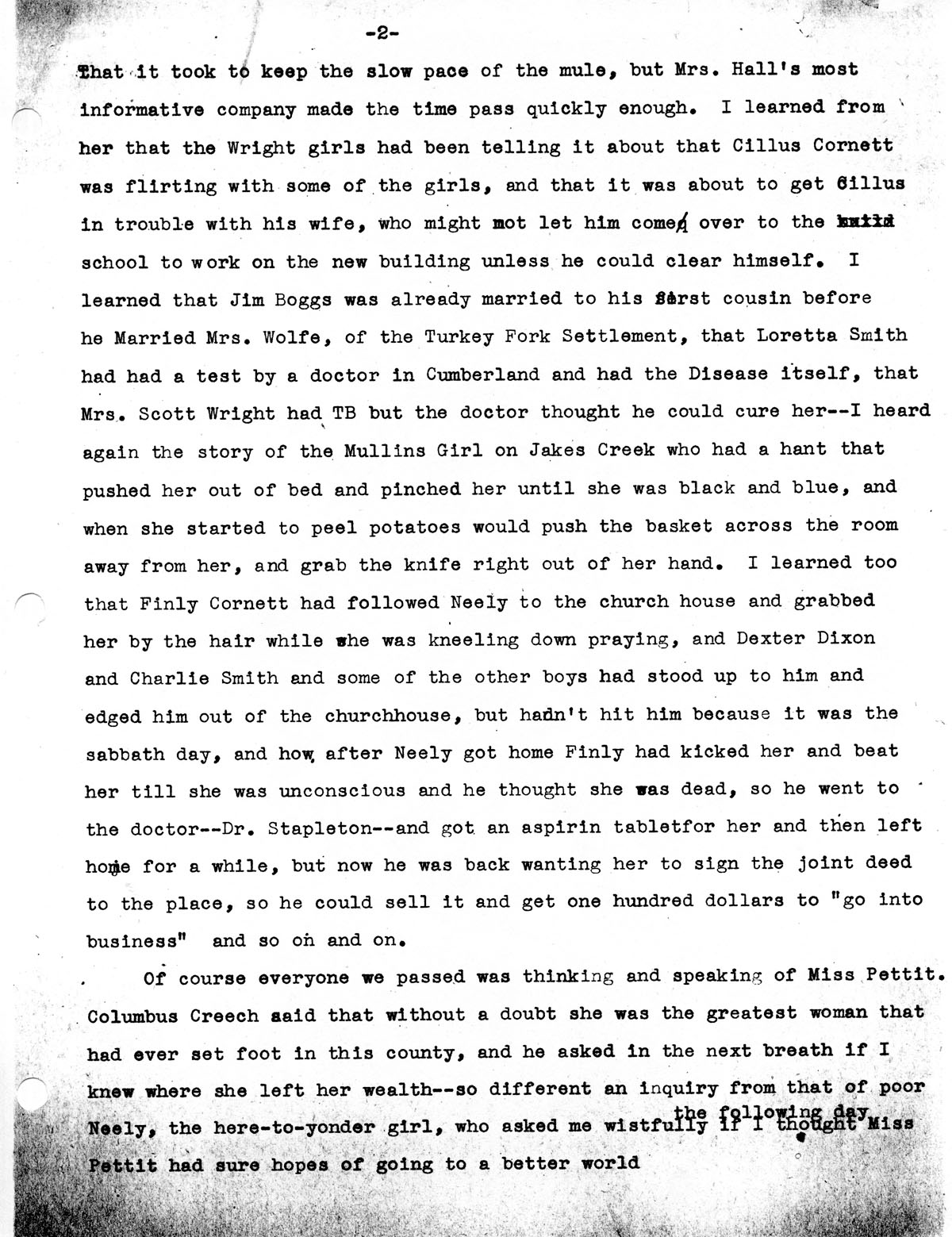 …that it took to keep the slow pace of the mule, but Mrs. Hall’s most informative company made the time pass quickly enough. I learned from her that the Wright girls had been telling it about that Cillus Cornett was flirting with some of the girls, and that it was about to get Cillus in trouble with his wife, who might not let him come over to the school to work on the new building unless he could clear himself. I learned that Jim Boggs was already married to his first cousin before he married Mrs. Wolfe, of the Turkey Fork Settlement, that Loretta Smith had had a test by a doctor in Cumberland and had the Disease itself, that Mrs. Scott Wright had TB but the doctor thought he could cure her — I heard again the story of the Mullins Girl on Jakes Creek who had a hant that pushed her out of bed and pinched her until she was black and blue, and when she started to peel potatoes would push the basket across the room away from her, and grab the knife right out of her hand. I learned too that Finly Cornett had followed Neely to the church house and grabbed her by the hair while she was kneeling down praying, and Dexter Dixon and Charlie Smith and some of the other boys had stood up to him and edged him out of the church house, but hadn’t hit him because it was the sabbath day, and how after Neely got home Finly had kicked her and beat her till she was unconscious and he thought she was dead, so he went to the doctor — Dr. [Ida] Stapleton — and got an aspirin tablet for her and then left home for a while, but now he was back wanting her to sign the joint deed to the place, so he could sell it and get one hundred dollars to “go into business” and so on and on.