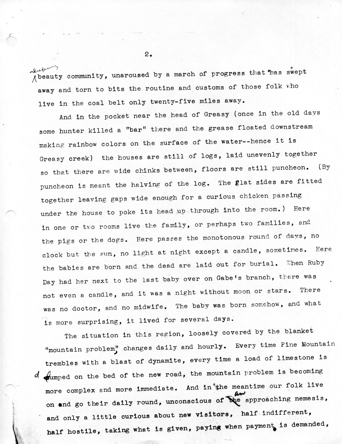 And in the pocket near the head of Greasy (once in the old days some hunter killed a “bar” there and the grease floated downstream making rainbow colors on the surface of the water — hence it is Greasy creek) the houses are still of logs, laid unevenly together so that there are wide chinks between, floors are still puncheon. (By puncheon is meant the halving of the log. The flat sides are fitted together leaving gaps wide enough for a curious chicken passing under the house to poke its head up through into the room.) Here in one or two rooms live the family, or perhaps two families, and the pigs or the dogs. Here passes the monotonous round of days, no clock but the sun, no light at night except a candle, sometimes. Here the babies are born and the dead are laid out for burial. Then Ruby Day had her next to the last baby over on Gabe’s branch, there was not even a candle, and it was a night without moon or stars. There was no doctor and no midwife. The baby was born somehow, and what is more surprising, it lived for several days.