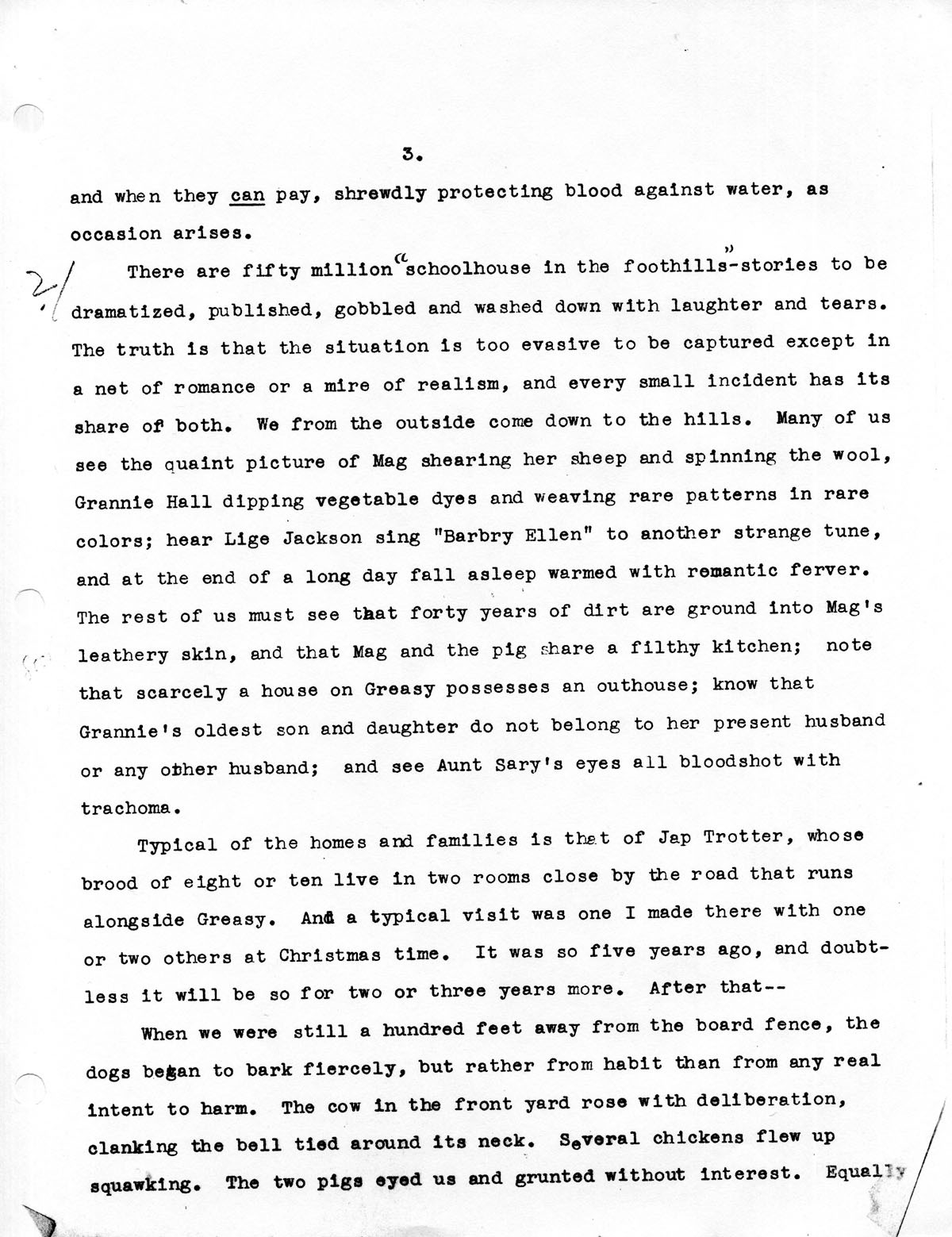 There are fifty million “schoolhouse in the foothills” stories to be dramatized, published, gobbled and washed down with laughter and tears. The truth is that the situation is too evasive to be captured except in a net of romance or a mire of realism, and every small incident has its share of both. We from the outside come down to the hills. Many of us see the quaint picture of Mag shearing her sheep and spinning the wool, Grannie Hall dipping vegetable dyes and weaving rare patterns in rare colors; hear Lige Jackson sing “Barbry Ellen” to another strange tune, and at the end of a long day fall asleep warmed with romantic ferver. The rest of us must see that forty years of dirt are ground into Mag’s leathery skin, and that Mag and the pig share a filthy kitchen; note that scarcely a house on Greasy possesses an outhouse; know that Grannie’s oldest son and daughter do not belong to her present husband or any other husband; and see Aunt Sary‘s eyes all bloodshot with trachoma.