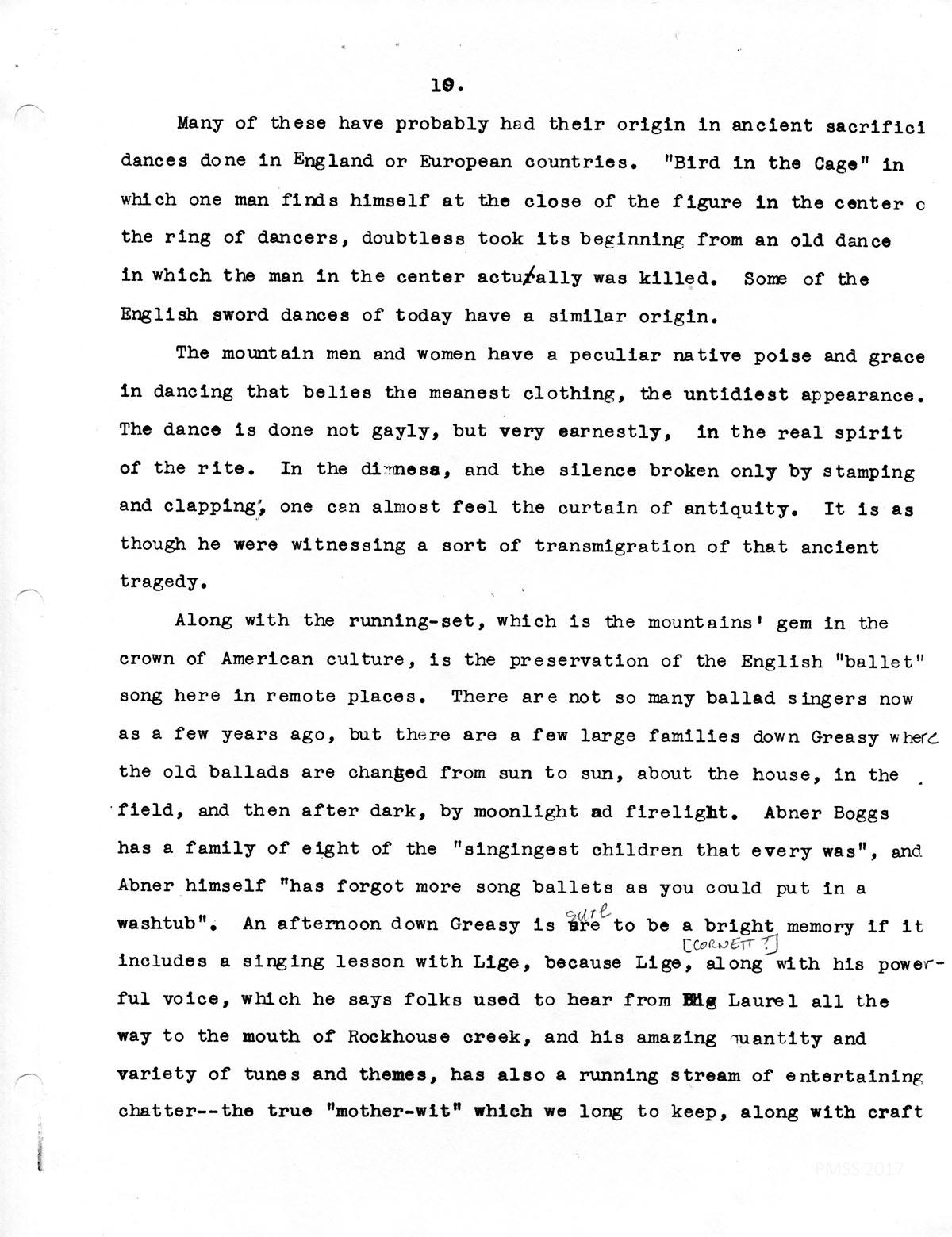 Along with the running-set, which is the mountains’ gem in the crown of American culture, is the preservation of the English “ballet” song here in remote places. There are not so many ballad singers now as a few years ago, but there are a few large families down Greasy where the old ballads are changed from sun to sun, about the house, in the field, and then after dark, by moonlight and firelight. Abner Boggs has a family of eight of the “singingest children that every was,” and Abner himself “has forgot more song ballets as you could put in a washtub”. An afternoon down Greasy is sure to be a bright memory if it includes a singing lesson with Lige, because Lige, along with his powerful voice, which he says folks used to hear from Big Laurel all the way to the mouth of Rockhouse creek, and his amazing quantity and variety of tunes and themes, has also a running stream of entertaining chatter — the true “mother-wit” which we long to keep, along with craft…