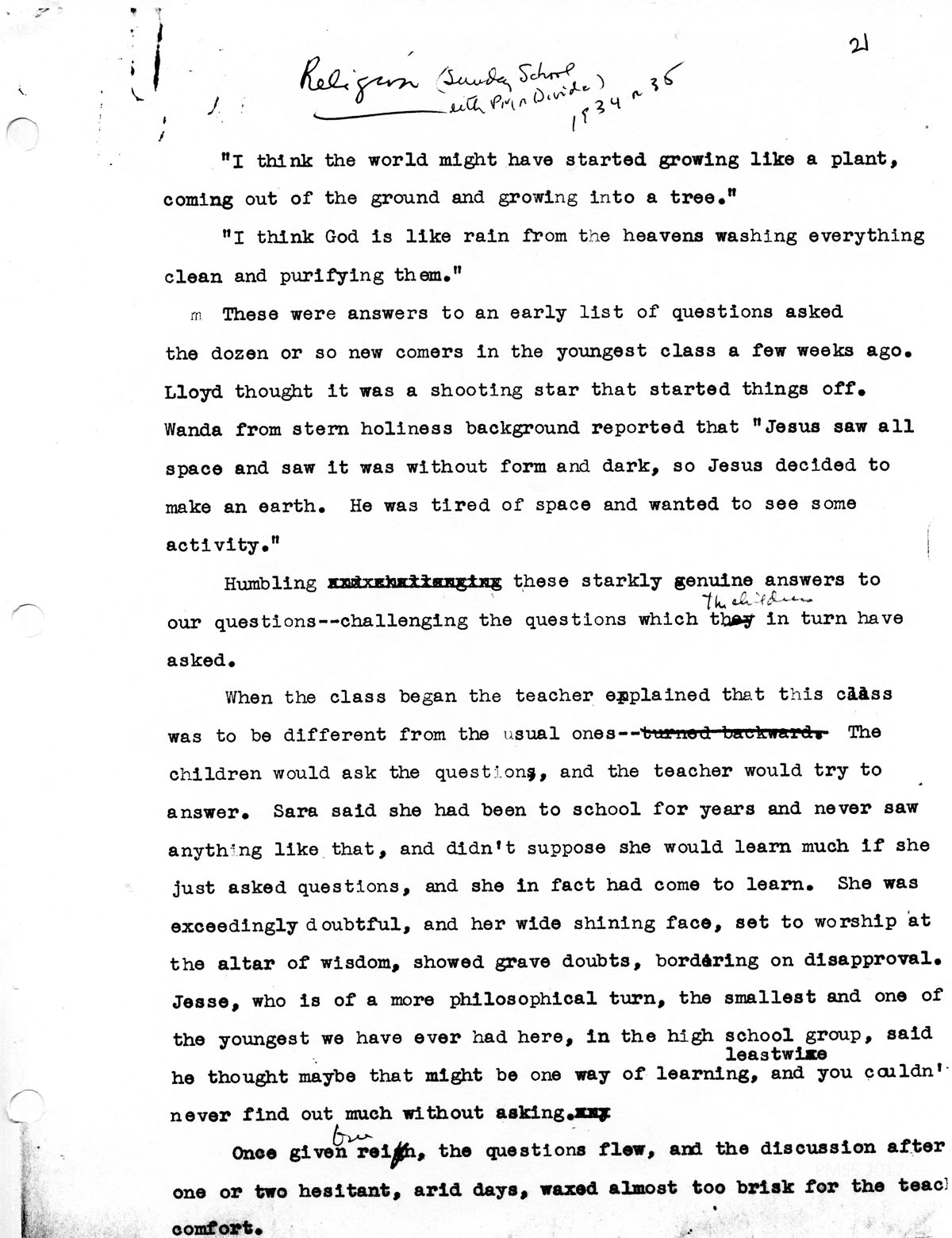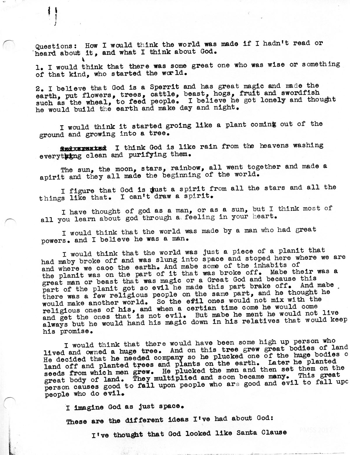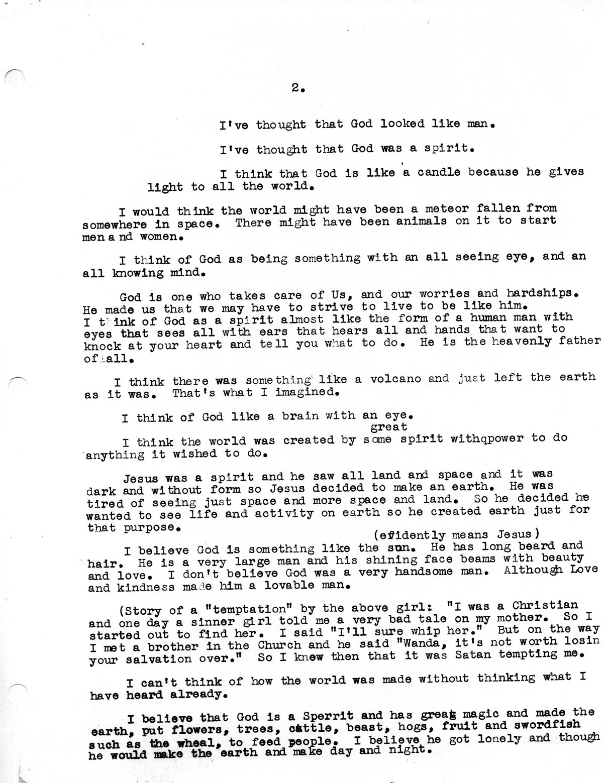 “I would think that the world was just a piece of a planit that had maybe broke off and was slung into space and stopped here where we are and where we [came to ]the earth. And maybe some of the inhabits of the planit was on the part of it that was broke off. Maybe their was a great man or beast that was magic or a Great God and because this part of the planit got so evil he made this part brake off. And maybe there was a few religious people on the same part, and he thought he would make another world. so the evil ones would not mix with the religious ones of his and when a certain time come he would come and get the ones that is not evil. But maybe he meant he would not live always but he would hand his magic down in his relatives that would keep his promise.”