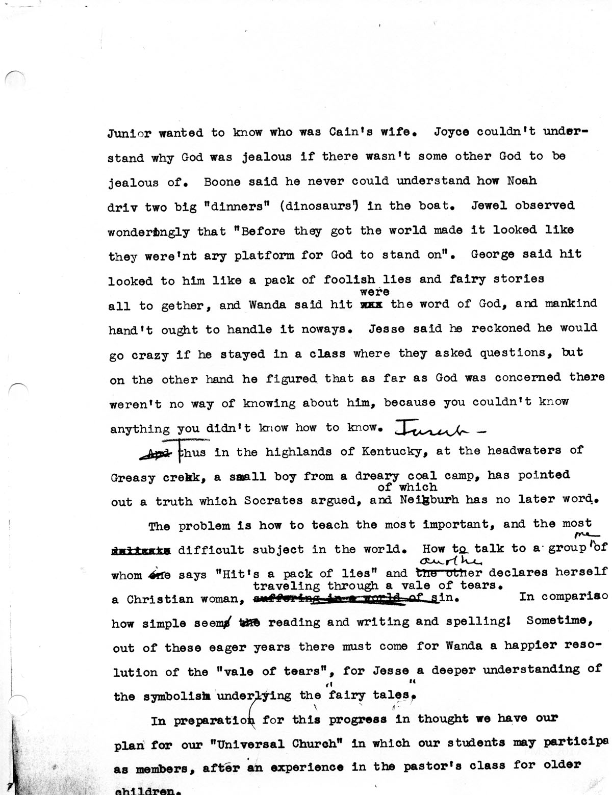 The problem is how to teach the most important and the most difficult subject in the world. How to talk to a group, one of whom says “Hit’s a pack of lies,” and the other declares herself a Christian woman, “traveling through a vale of tears.” In comparison how simple seems reading and writing and spelling! Sometime, out of these eager years, there must come for Wanda a happier resolution of the ‘vale of tears,’ for Jesse a deeper understanding of the symbolism underlying the ‘fairy tales.