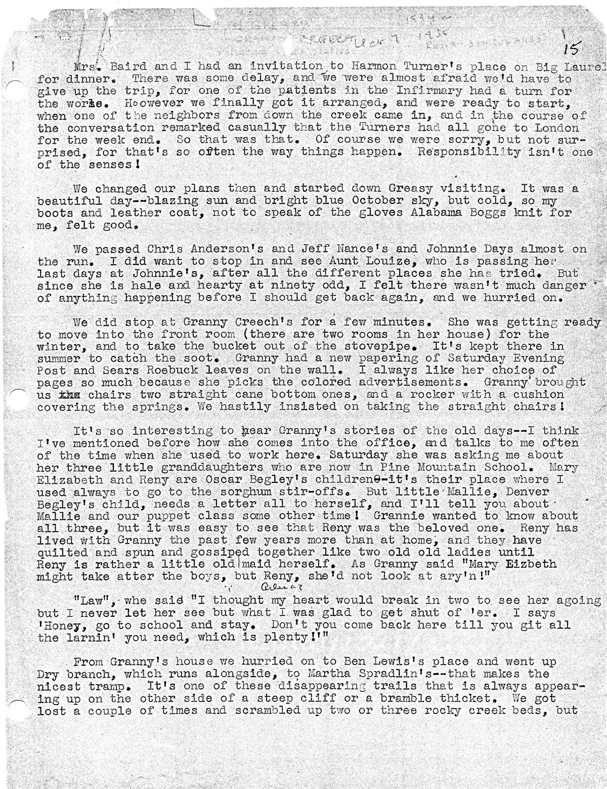 It’s so interesting to hear Granny’s stories of the old days — I think I’ve mentioned before how she comes into the office and talks to me often of the time when she used to work here. Saturday she was asking me about her three little granddaughters who are now in Pine Mountain School. Mary Elizabeth and Reny are Oscar Begley’s children — It’s their place where I used always to go to the sorghum stir-offs. But little Mallie, Denver Begley’s child, needs a letter all to herself, and I’ll tell you about Mallie and our puppet class some other time! Grannie wanted to know about all three, but it was easy to see that Reny was the beloved one. Reny has lived with Granny the past few years more than at home, and they have quilted and spun and gossiped together like two old old ladies until Reny is rather a little old maid herself. As Granny said “Mary Lizbeth might take atter the boys, but Reny, she’d not look at ary’n!” [Handwritten notation: “Arlene?”]
