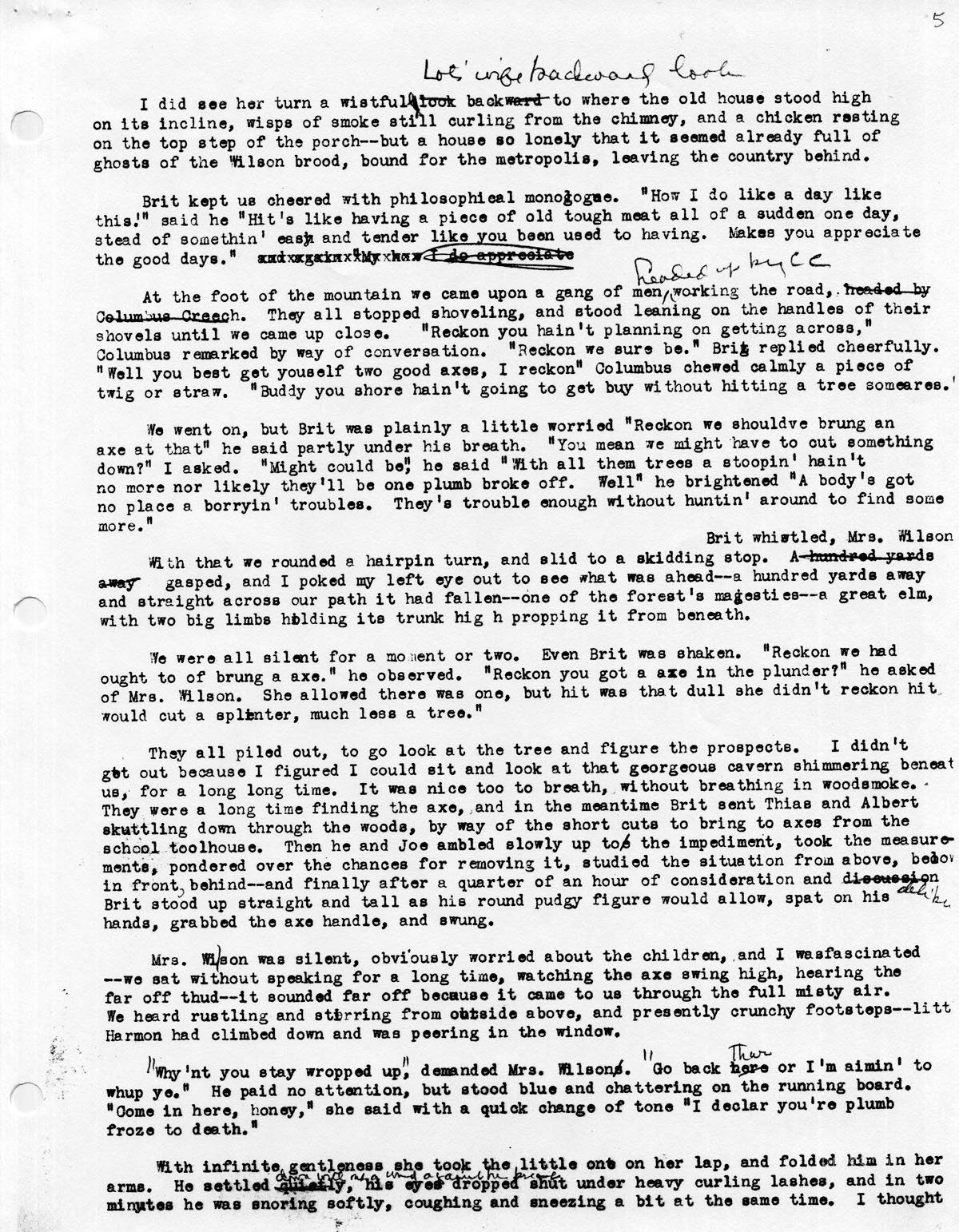 We were all silent for a moment or two. Even Brit was shaken. “Reckon we had ought to of brung a axe,” he observed. “Reckon you got a axe in the plunder?” he asked of Mrs. Wilson. She allowed there was one, but hit was that [so] dull she didn’t reckon hit would cut a splinter, much less a tree.”