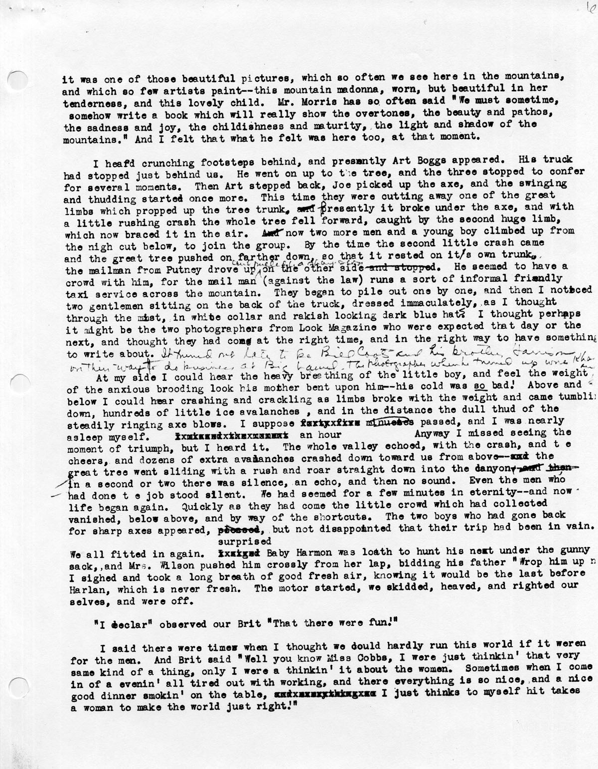 I heard crunching footsteps behind, and presently Art Boggs appeared. His truck had stopped just behind us. He went on up to the tree, and the three stopped to confer for several moments. Then Art stepped back, Joe picked up the axe, and the swinging and thudding started once more. This time they were cutting away one of the great limbs which propped up the tree trunk. Presently it broke under the axe and, with a little rushing crash, the whole tree fell forward, caught by the second huge limb, which now braced it in the air. Now two more men and a young boy climbed up from the high cut below to join the group. By the time the second little crash came and the great tree pushed on farther down, so that it rested on its own trunk. The mailman from Putney drove up on the other side and pulled a sharp saw. He seemed to have a crowd with him, for the mailman (against the law) runs a sort of informal friendly taxi service across the mountain. They began to pile out one by one, and then I noticed two gentlemen sitting on the back of the truck, dressed immaculately, as I thought through the mist, in white collar and rakish-looking dark blue hats. I thought perhaps it might be the two photographers from Look Magazine who were expected that day or the next, and thought they had come at the right time and in the right way to have something to write about. [Handwritten note: “It turned out later to be Bill Coots and his brother Harrison on their way to do business at Big Laurel.”] The photographers when they turned up were Khan and  [….?].