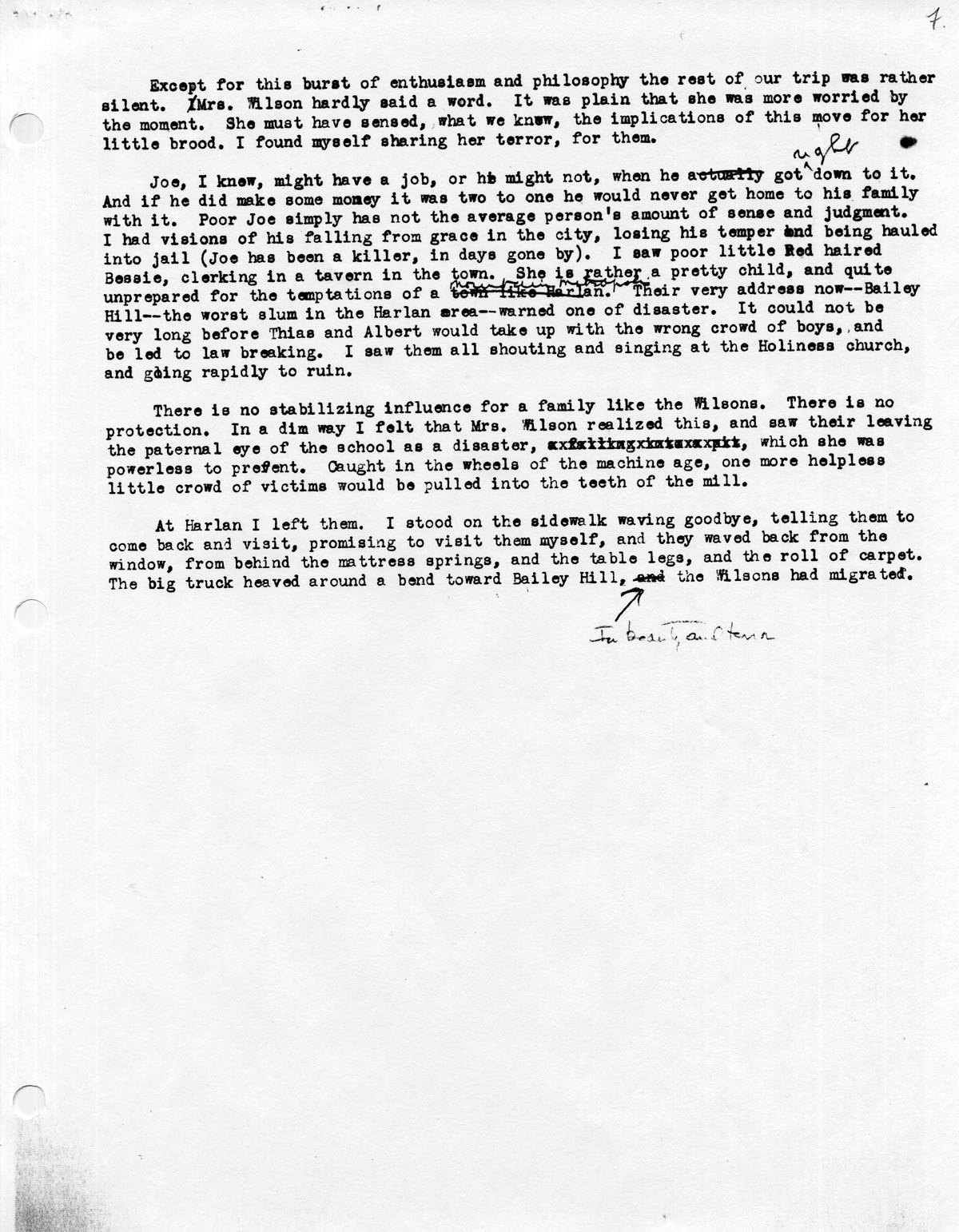 Joe, I knew, might have a job, or he might not, when he got right down to it. And if he did make some money it was two to one he would never get home to his family with it. Poor Joe simply has not the average person’s amount of sense and judgment. I had visions of his falling from grace in the city, losing his temper and being hauled into jail (Joe has been a killer, days gone by). I saw poor little red-haired Bessie, clerking in a tavern in the town. She is rather a pretty child, and quite unprepared for the temptations of a mountain metropolis [a town like Harlan]. Their very address now — Bailey Hill — the worst slum in the Harlan area — warned one of disaster. It could not be very long before ‘Thias and Albert would take up with the wrong crowd of boys, and be led to law breaking. I saw them all shouting and singing at the Holiness church and going rapidly to ruin.