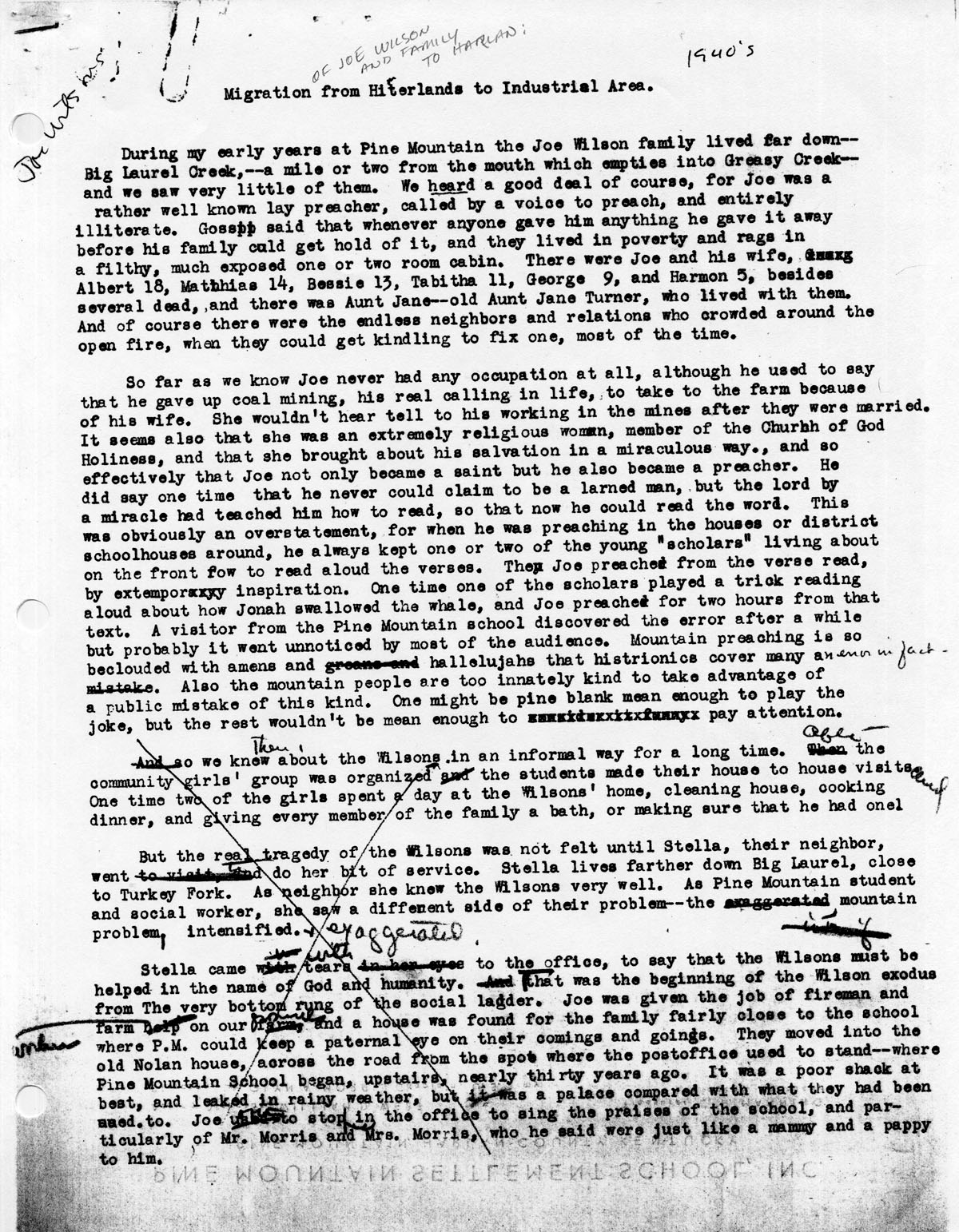 Stella came with tears to the office to say that the Wilsons must be helped in the name of God and humanity. That was the beginning of the Wilson exodus from the very bottom rung of the social ladder. Joe was given the job of fireman and farm worker on our grounds and a house was found for the family fairly close to the school where P.M. [Pine Mountain Settlement School] could keep a paternal eye on their comings and goings. They moved into the old Nolan house, across the road from the spot where the post office used to stand — when Pine Mountain School began upstairs, [in the Nolan house in 1913]  nearly thirty years ago. It was a poor shack at best and leaked in rainy weather, but a palace compared with what they had been used to. Joe stopped in the office to sing the praises of the school, and particularly of Mr. Morris [Glyn Morris] and Mrs. Morris, who he said were just like a ‘mammy’ and a ‘pappy’ to him.