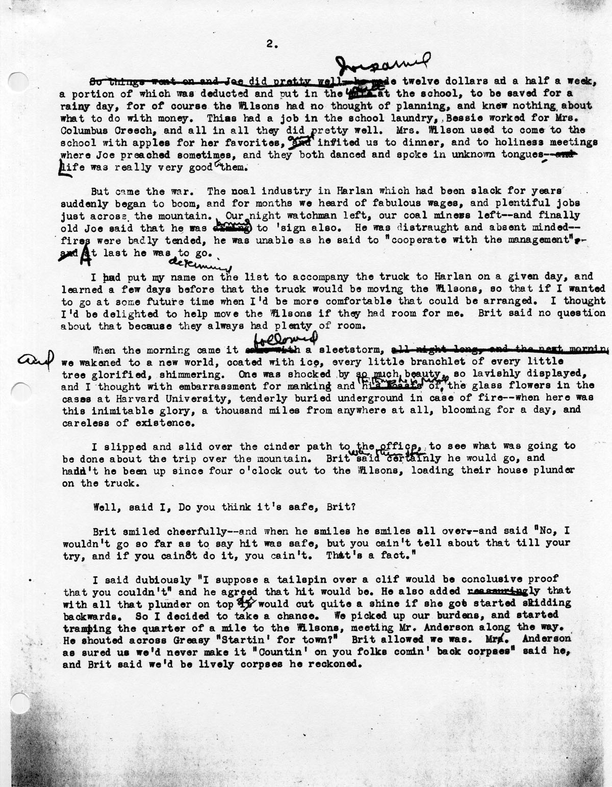 Insured [?] by twelve dollars and half a week, a portion of which was deducted and put in the safe at the school to be saved for a rainy day, for, of course, the Wilsons had no thought of planning and knew nothing about what to do with money.  ‘Thias [Mathias] had a job in the school laundry, Bessie worked for Mrs. Columbus Creech, and all in all, they did pretty well. Mrs. Wilson used to come to the school with apples for her favorites and invited us to dinner and to holiness meetings where Joe preached sometimes and they both danced and spoke in unknown tongues [“speaking in tongues”] — life was really good to them.