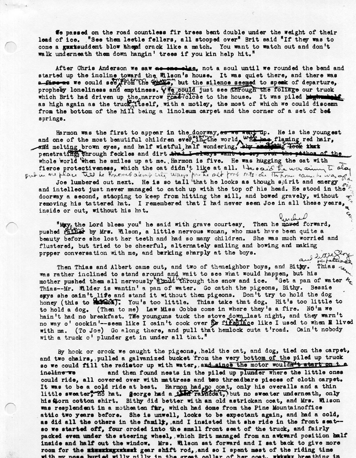 Harmon [son of Joe] was the first to appear in the doorway. He is the youngest and one of the most beautiful children ever [to be born ?] in the world with flaming red hair and melting brown eyes, and a half wistful, half wondering shy smile penetrating through freckles and dirt [that I always want to cry over the paths of the whole world when he smiles up at me.] Harmon is five. He was hugging the cat with fierce protectiveness, which the cat didn’t like at all. He said he was aiming to stay put in one place till he knowed about city ways ‘fore he set foot outside the house because he was afraid [he would] git  …… [? handwritten and not decipherable].