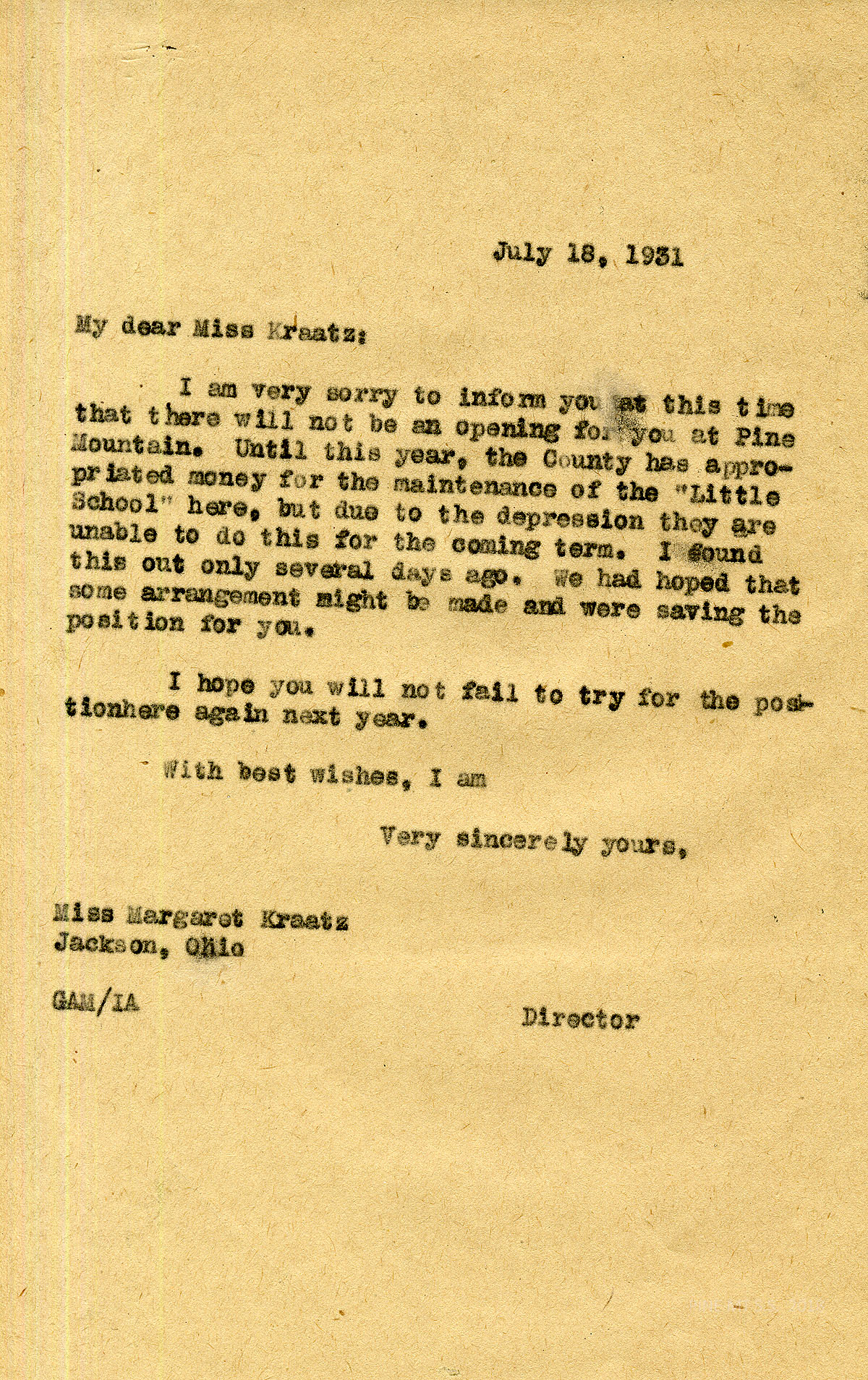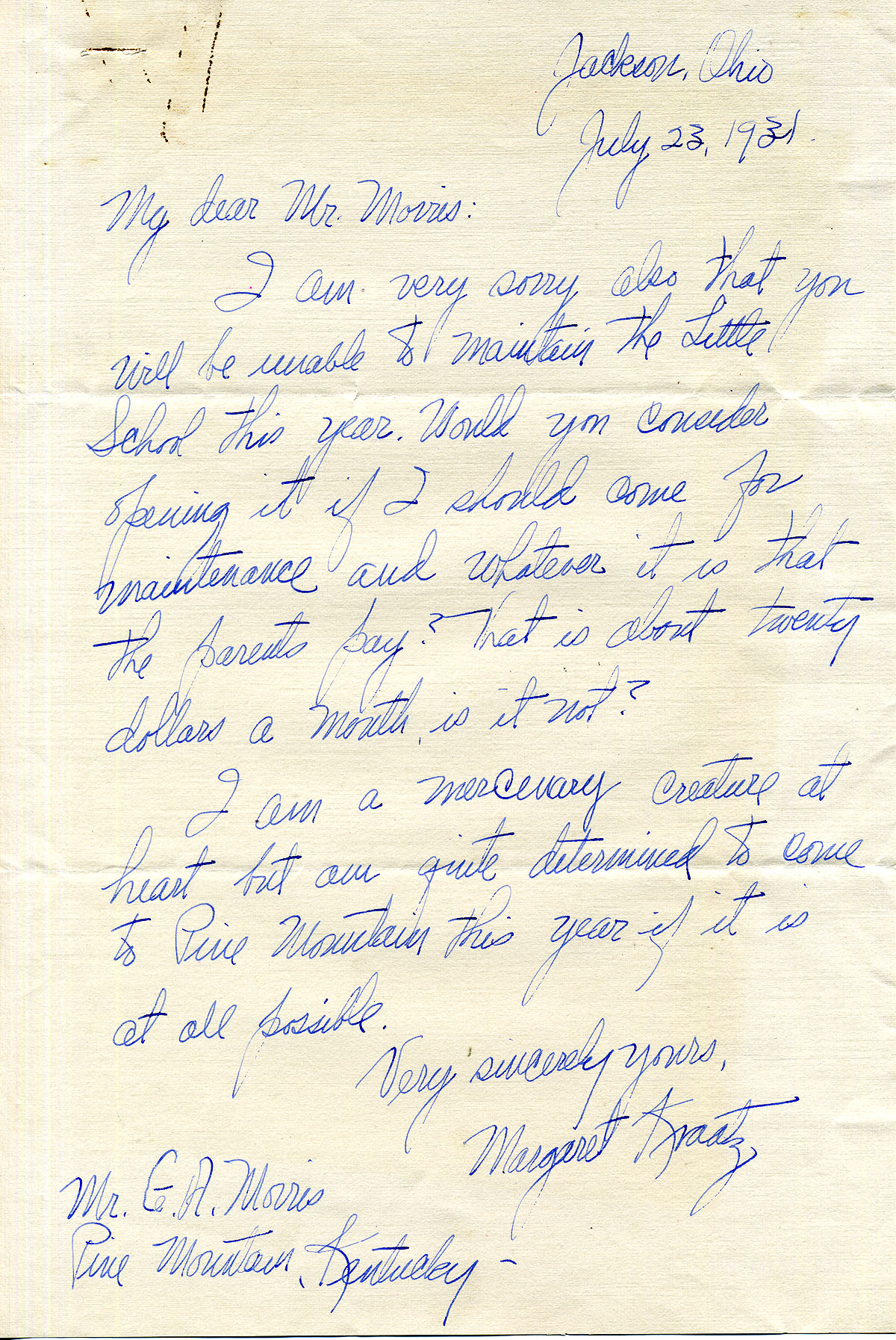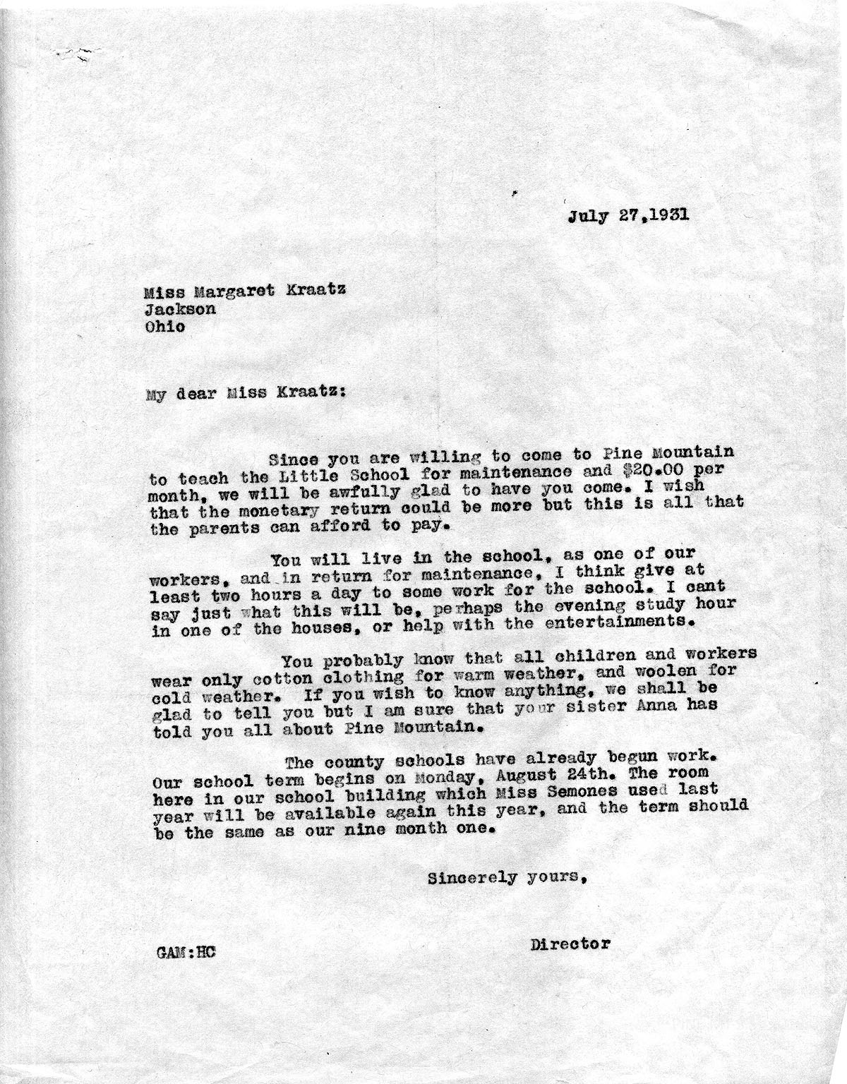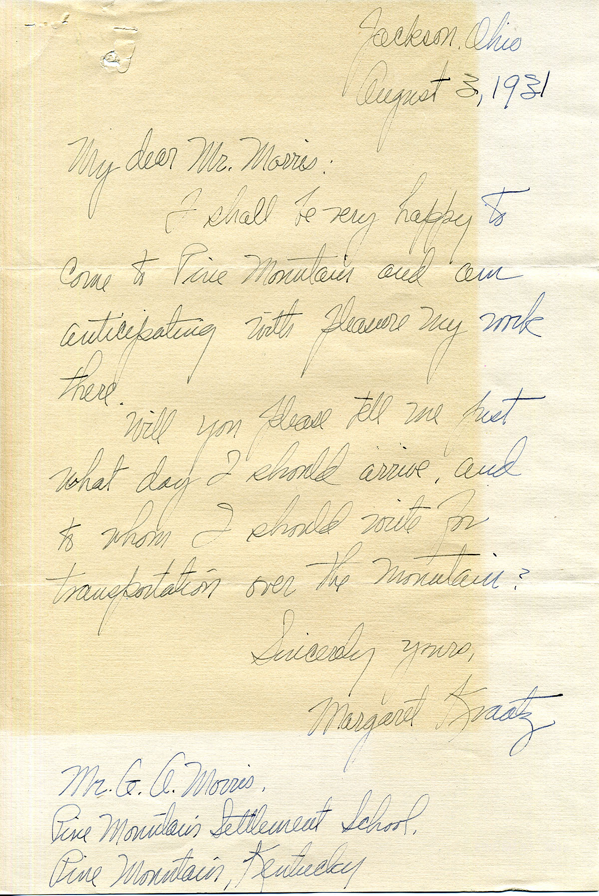 TAGS: Margaret Kraatz; Margaret Kraatz Wright Correspondence; Pine Mountain Settlement School, KY