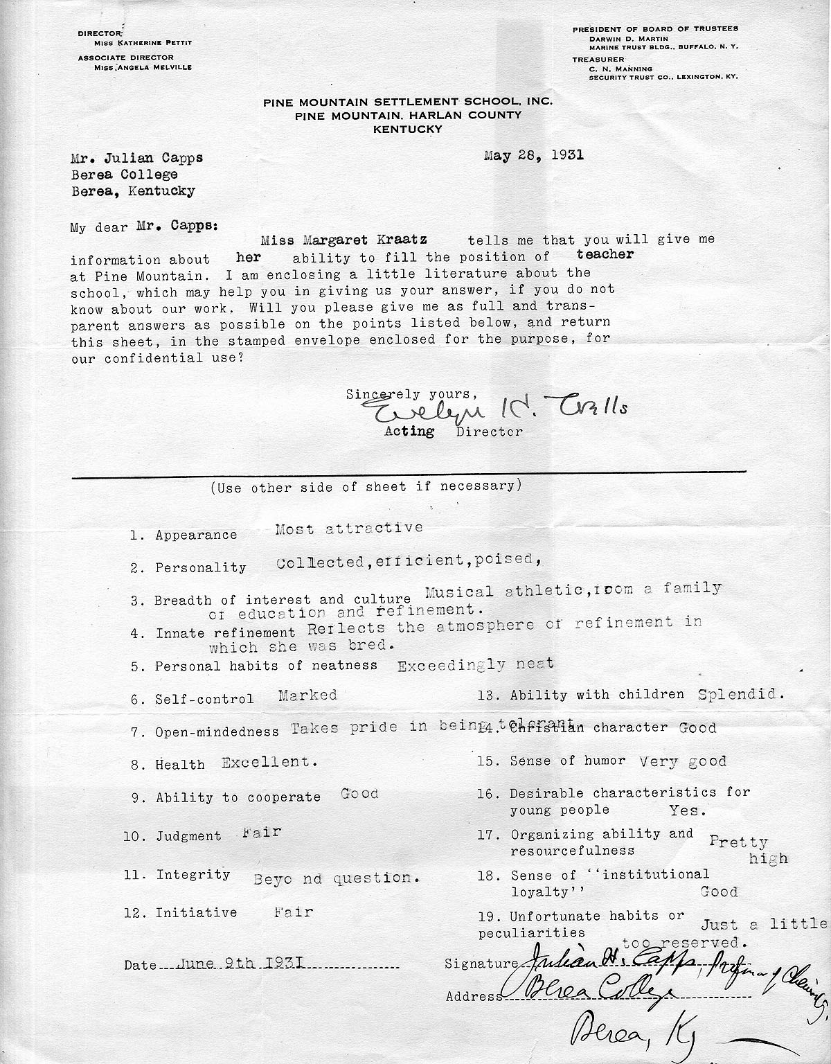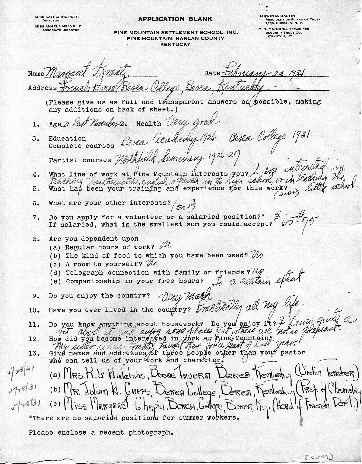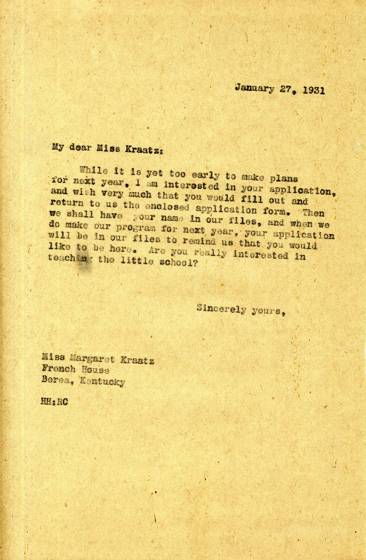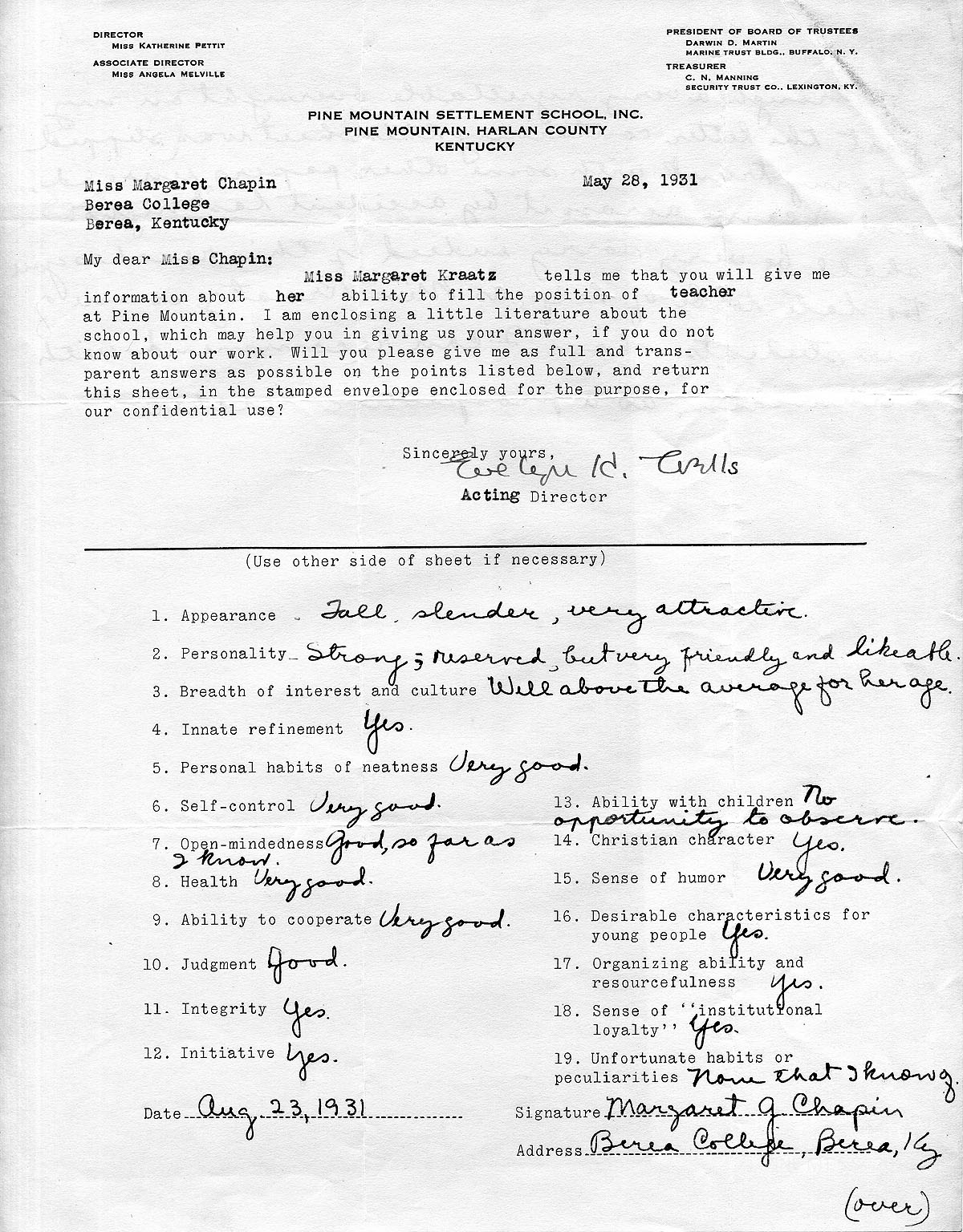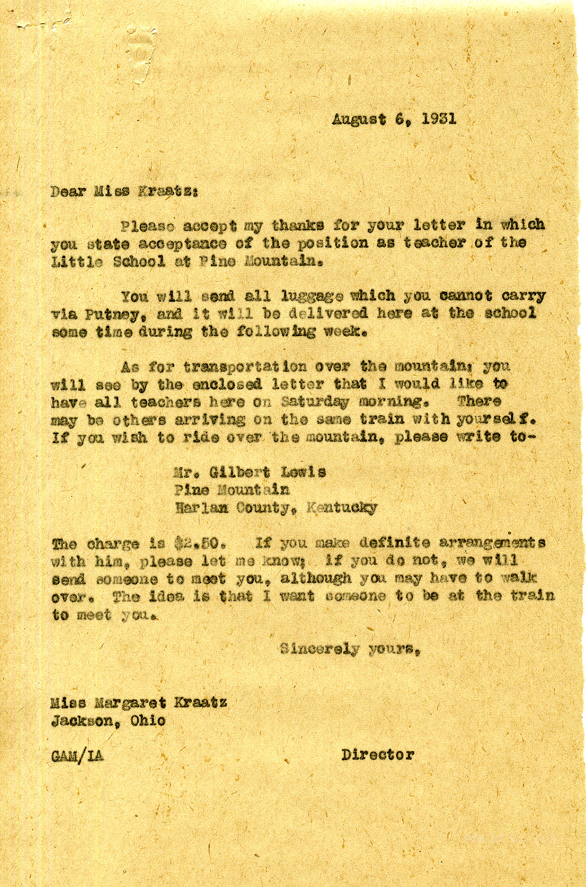 TAGS: Margaret Kraatz; Margaret Kraatz Wright Correspondence; Pine Mountain Settlement School, KY