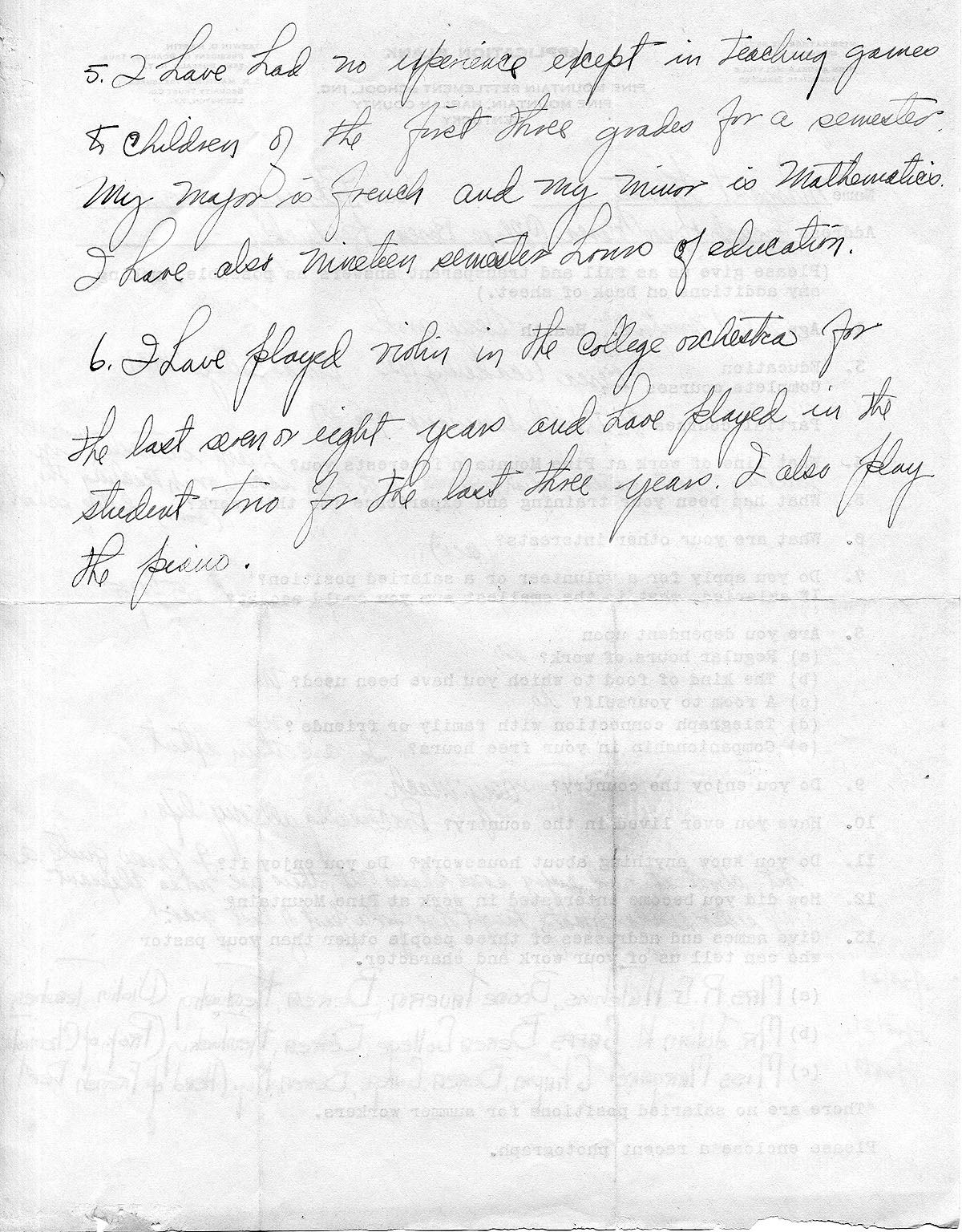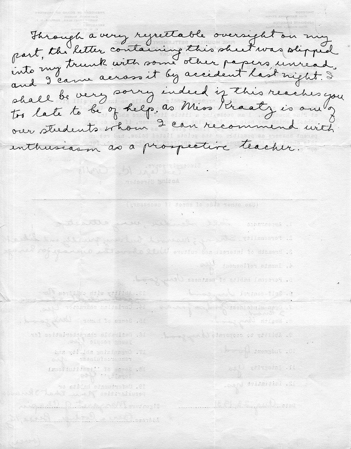 10/8/31 She likes teaching geometry, but not English. Their dance lasted until 9:30 which is late for Pine Mt. She talks about one of his female students. She must get up for breakfast because she has no food.